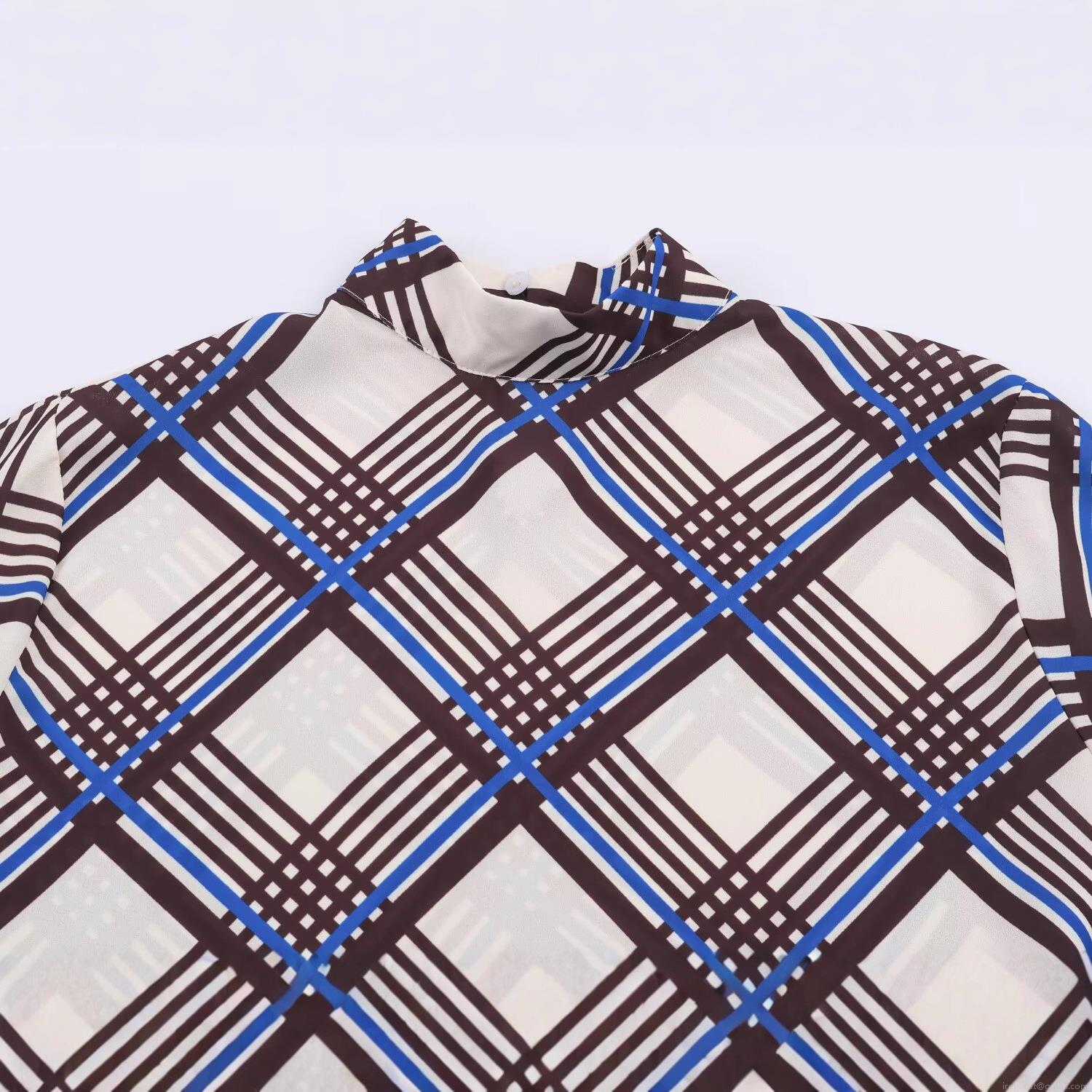 Women Retro Plaid Blouse Polyester Chiffon Mock Neck Long Sleeve Color Block Checkered Shirt Elegant Autumn Streetwear Pullover Top