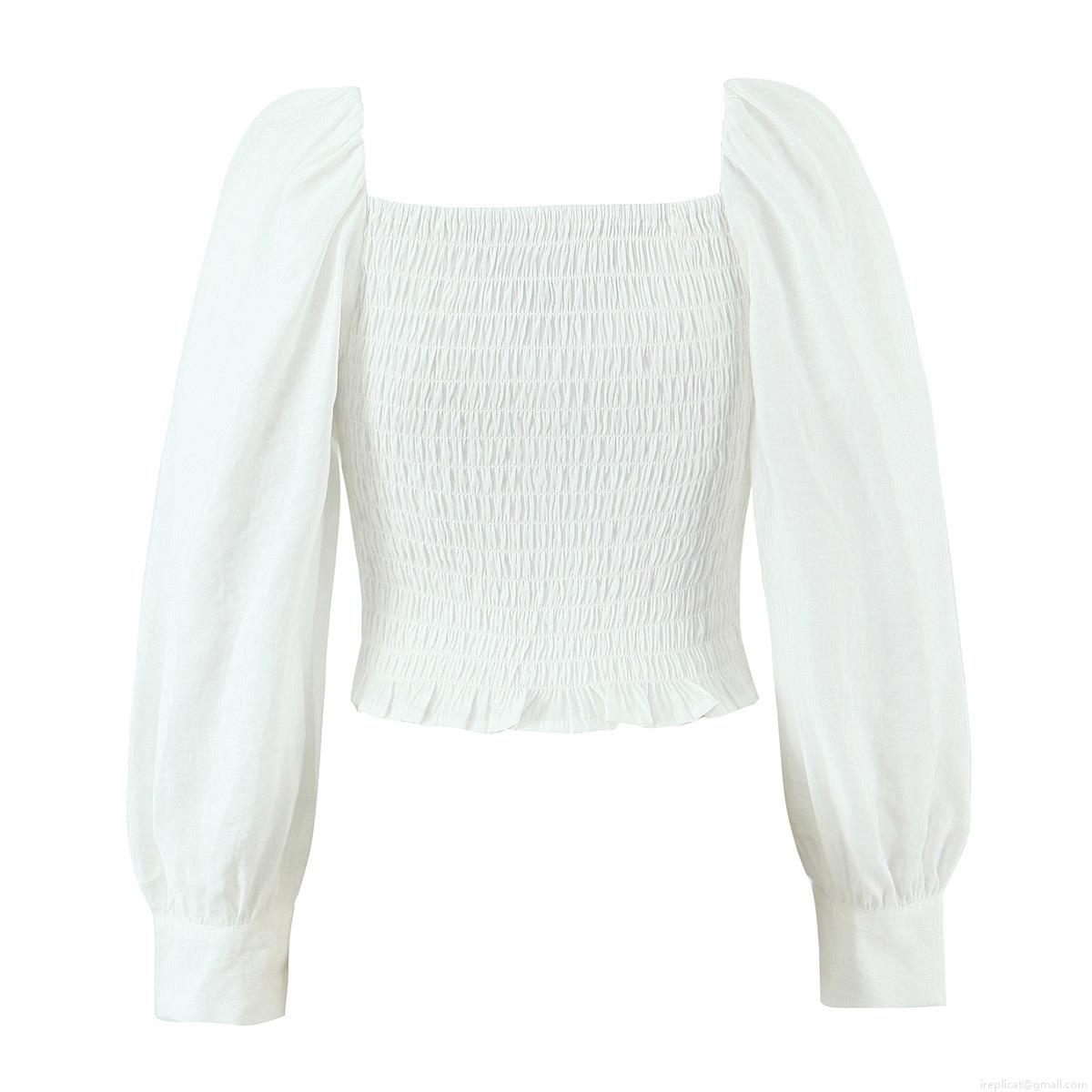 • Women Retro Square Neck Puff Sleeve Blouse Smocked Back Crop Top Solid Color Polyester Blend Elegant Long Sleeve Shirt For Party Date
