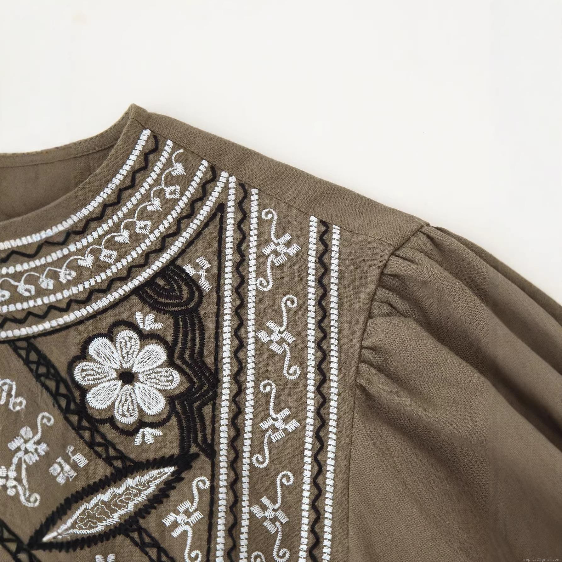 Women Round Neck Long Lantern Sleeve Floral Embroidery Blouse Casual Button Down Polyester Shirt Bohemian Spring Streetwear Top