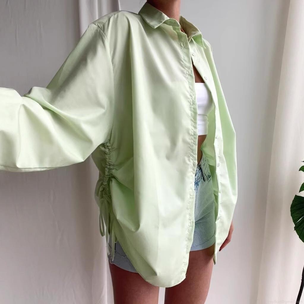 • Women Ruched Blouse 100% Polyester Side Drawstring Long Sleeve Light Green Shirt Casual Loose Button Down Top For Lady