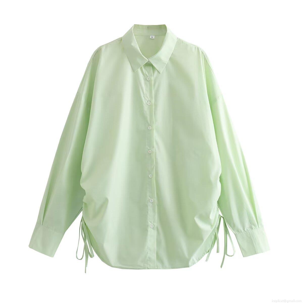 Women Ruched Blouse 100% Polyester Side Drawstring Long Sleeve Light Green Shirt Casual Loose Button Down Top For Lady