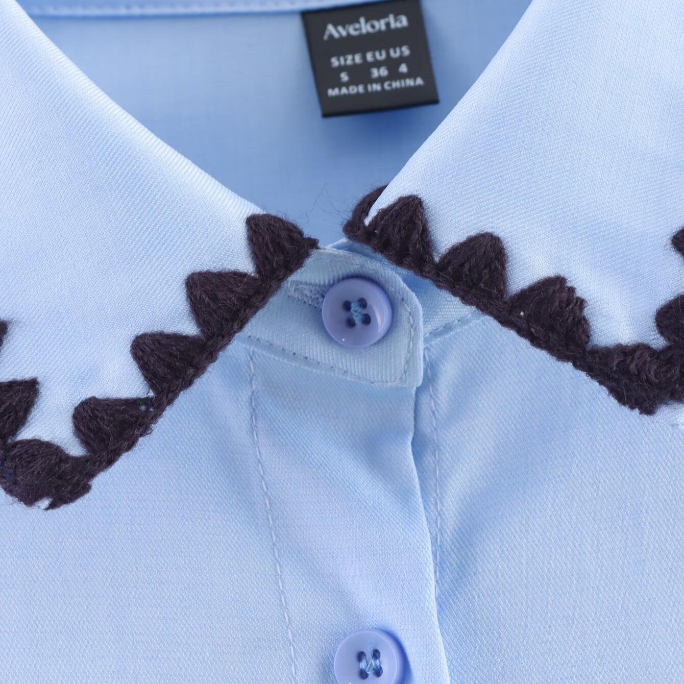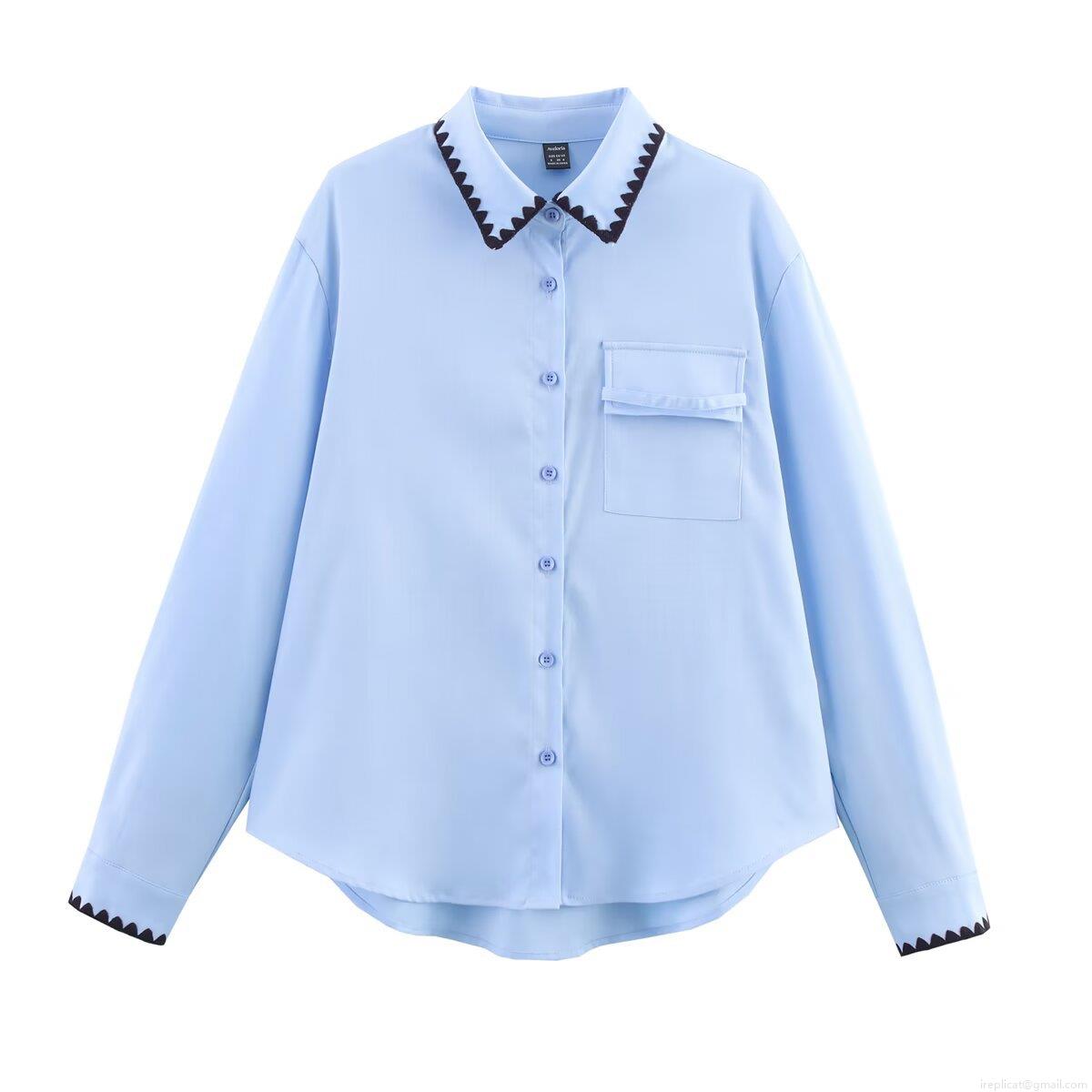 • Women Scalloped Trim Long Sleeve Loose Shirt Polyester Solid Color Lapel Blouse With Single Pocket Casual Street Style Autumn Top