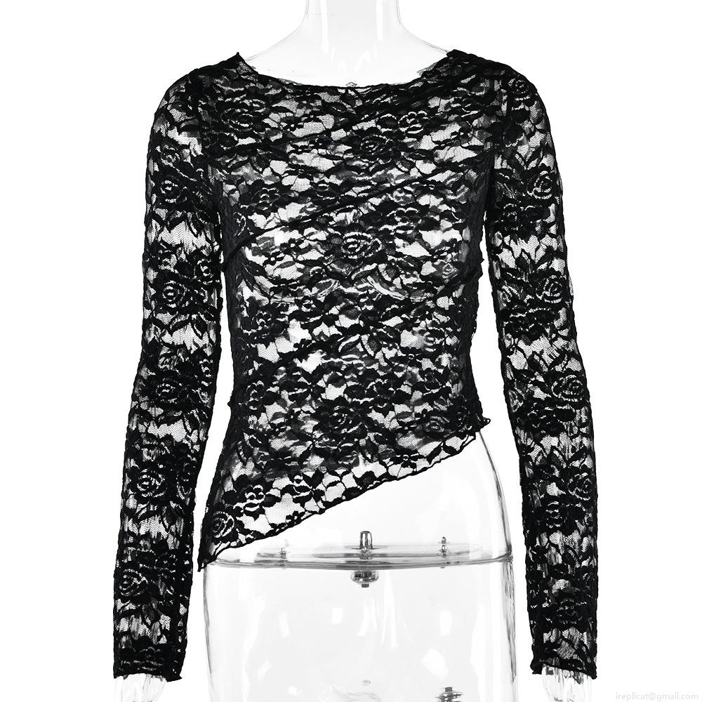• Women Sexy Black Lace Perspective Top Flare Sleeve Round Neck Slim Fit Long Sleeve Blouse Streetwear Party Clubwear Asymmetric Hem See Through Mesh Shirt