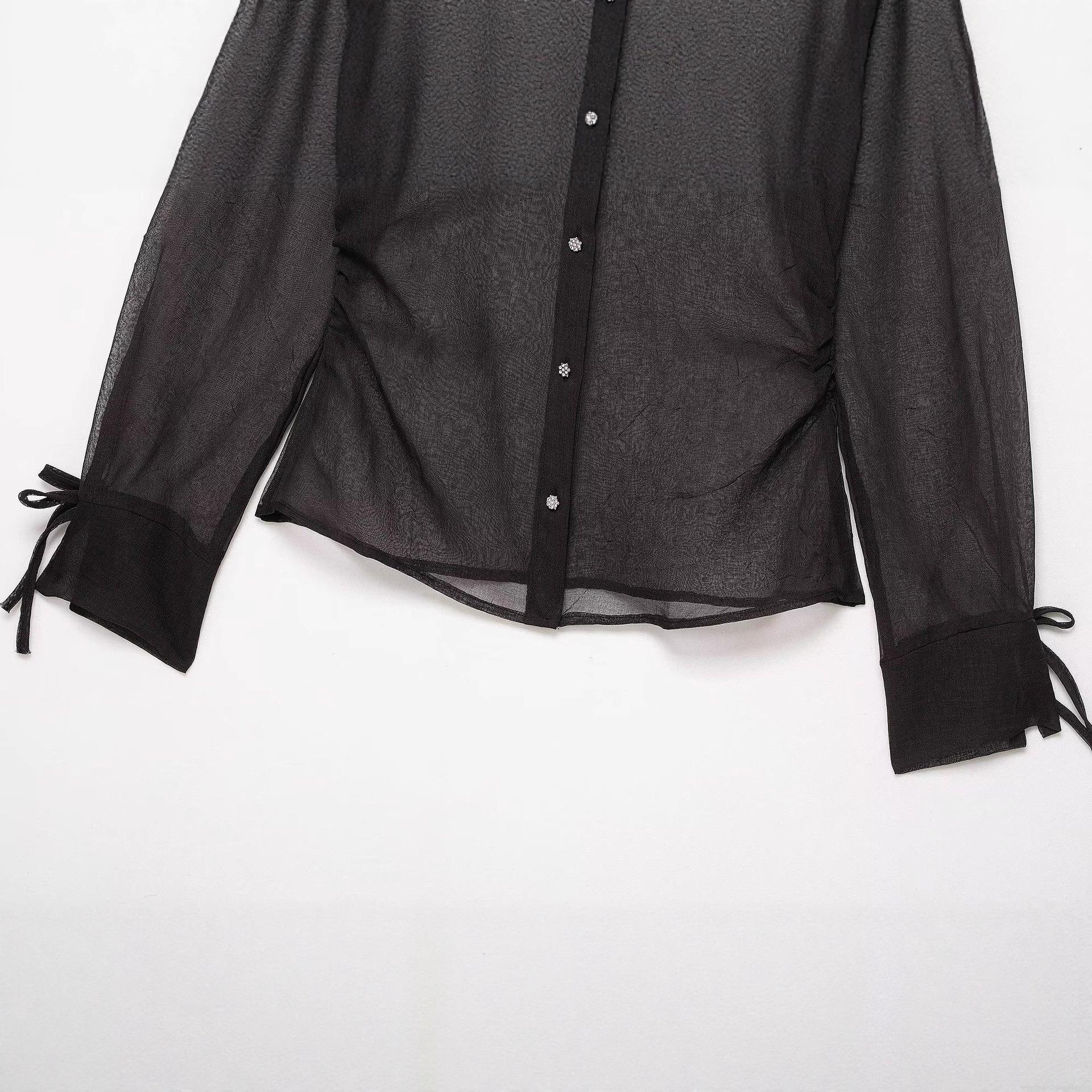 • Women Sexy Black Sheer Mesh Blouse Long Sleeve Button Down Shirt With Bow Tie Cuffs Rhinestone Buttons Elegant Lapel Top For Party Daily Wear