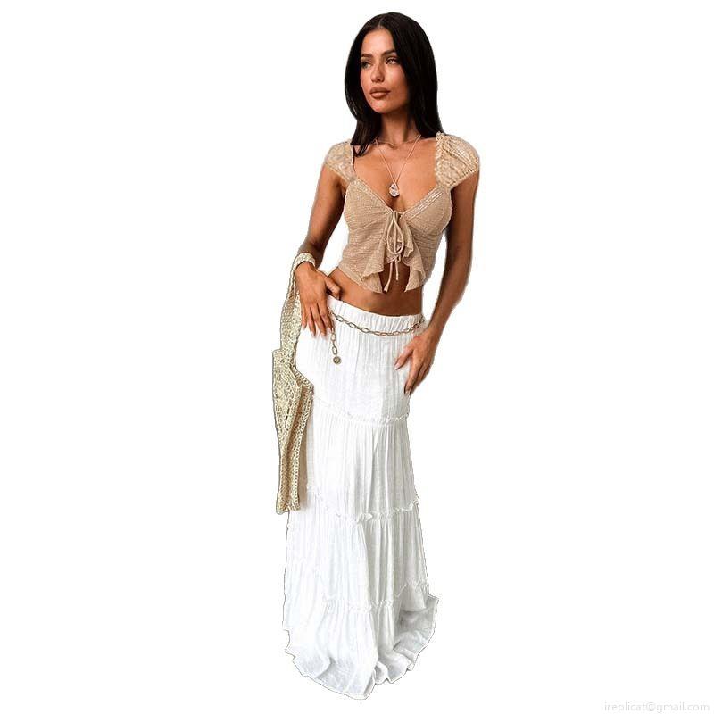 • Women Sexy Khaki Lace Crop Top Ruffle Hem Tie-Front Vintage Boho Mesh Blouse Summer Vacation Sheer Floral Embroidery Short Sleeve Cami Top
