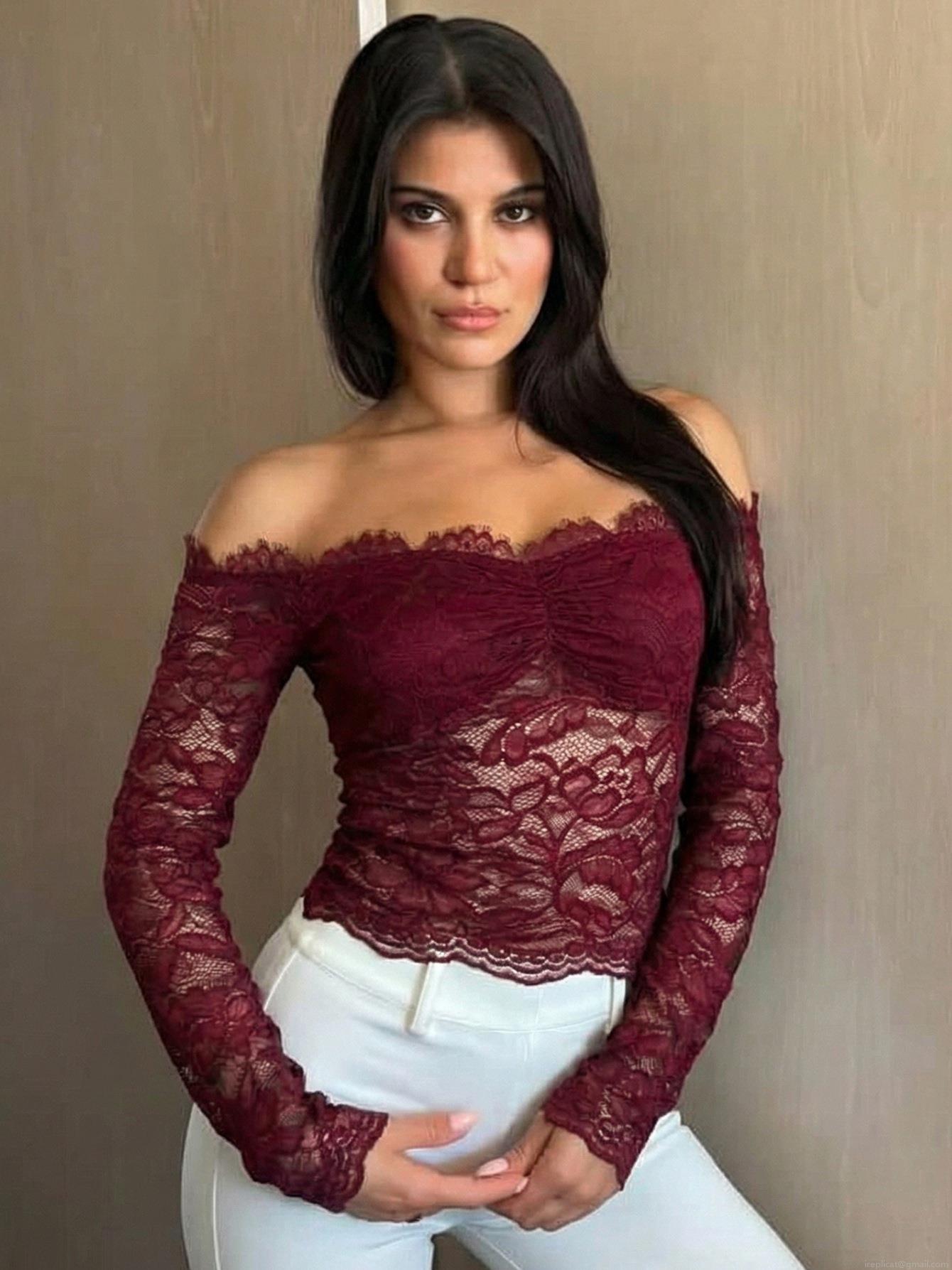 • Women Sexy Off Shoulder Lace Long Sleeve Top Wine Red Floral Hollow Out Slim Fit Mesh Blouse For Party Clubwear Streetwear Lady