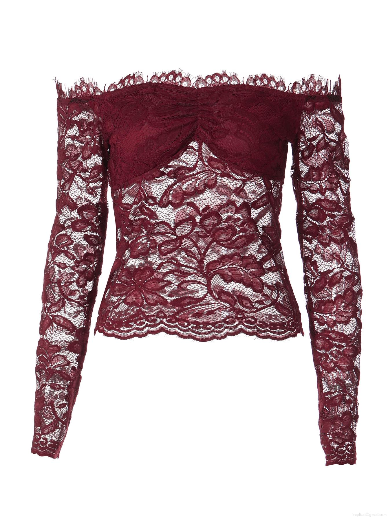 Women Sexy Off Shoulder Lace Long Sleeve Top Wine Red Floral Hollow Out Slim Fit Mesh Blouse For Party Clubwear Streetwear Lady