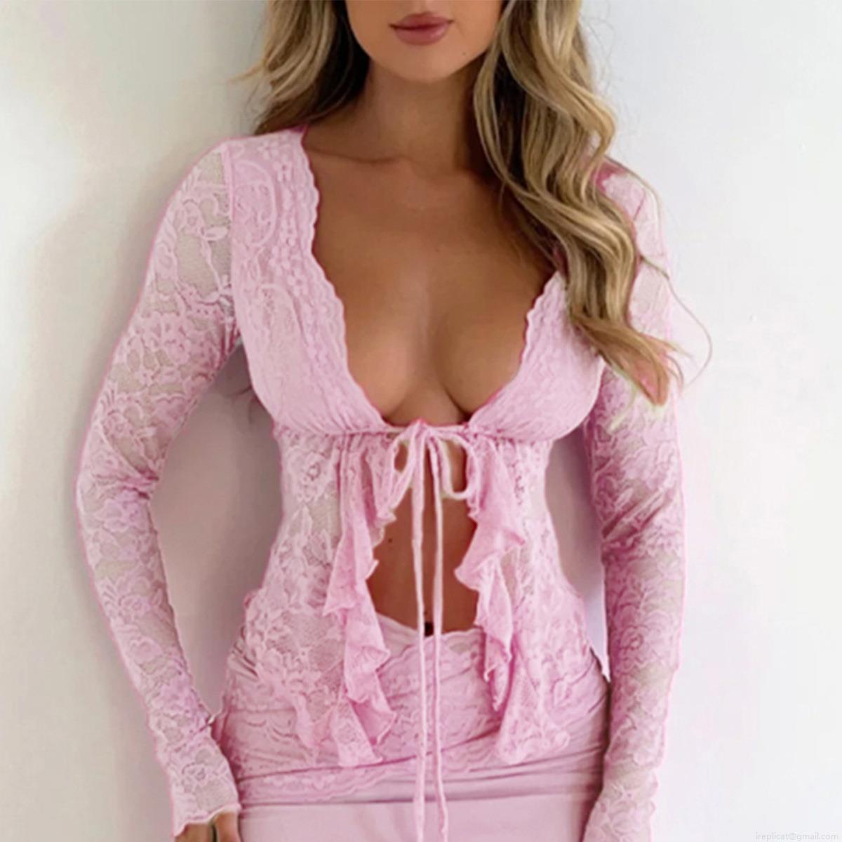• Women Sexy See-through Lace Cardigan V-Neck Tie-Front Long Sleeve Floral Mesh Top For Vacation Party Summer Y2K Streetwear Fashion Slim Fit Polyamide Elastane Blouse