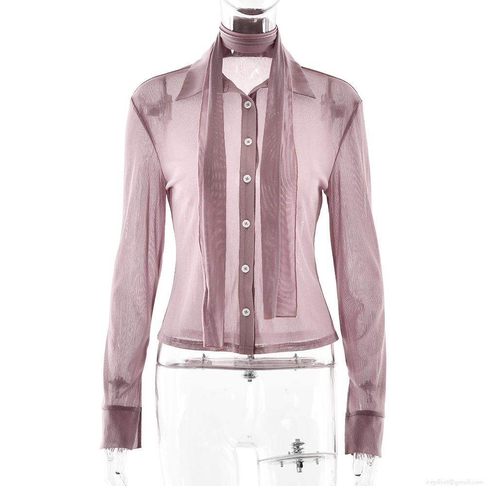 • Women Sexy See-Through Mesh Shiny Silk Shirt Long Sleeve Lapel Button Up Blouse With Matching Neck Tie Retro Y2K Party Clubwear Streetwear Tops