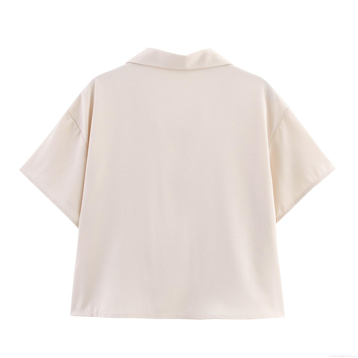 • Women Short Sleeve Embroidered Blouse Coconut Tree Pattern Lapel V-Neck Vacation Style Cotton Linen Texture Summer Cropped Top For Beach Resort
