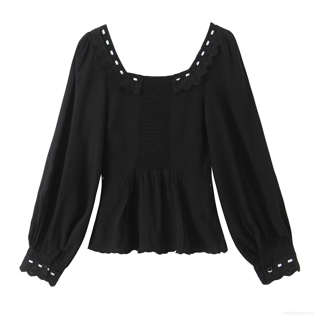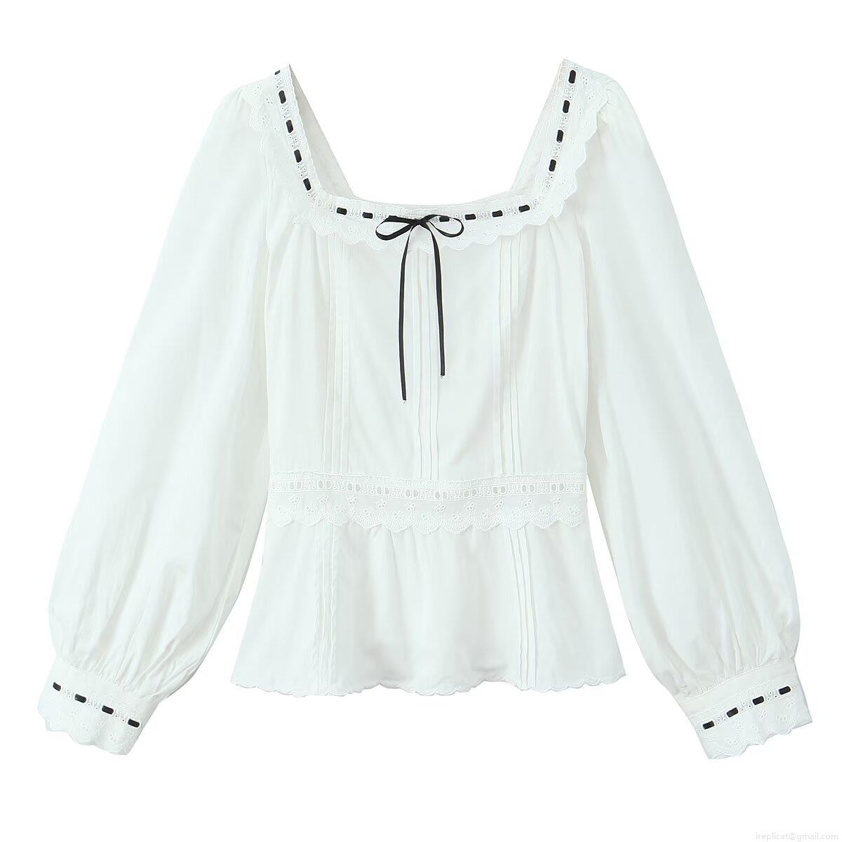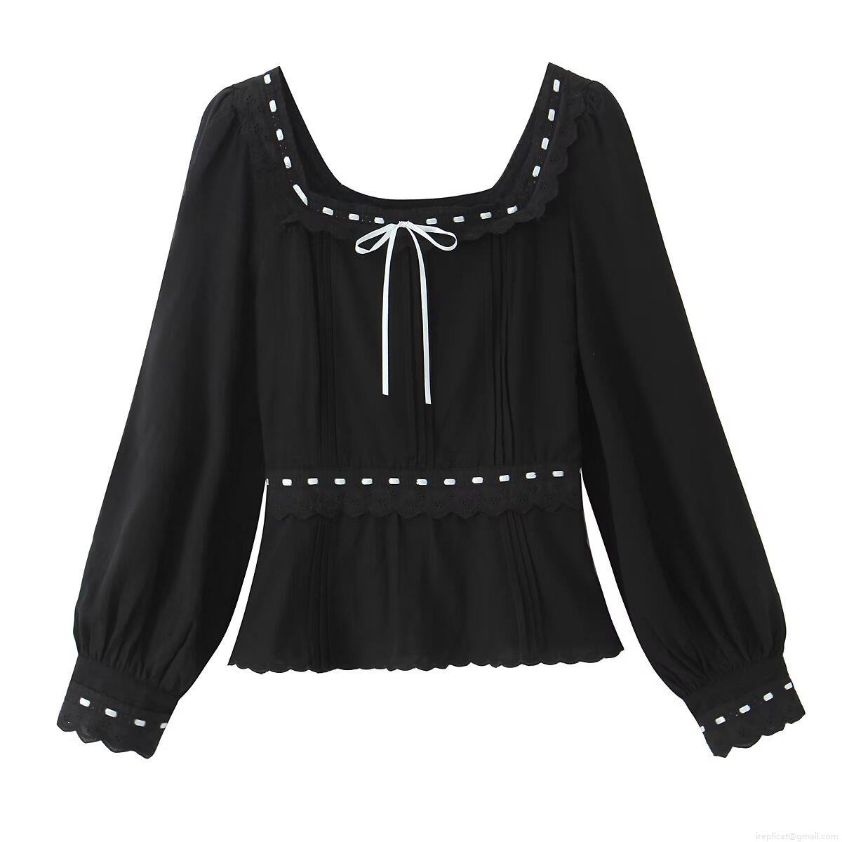 Women Square Neck Lace Trim Embroidery Blouse Tencel Viscose Blend Puff Sleeve Bow Hollow Out Shirt Casual Top