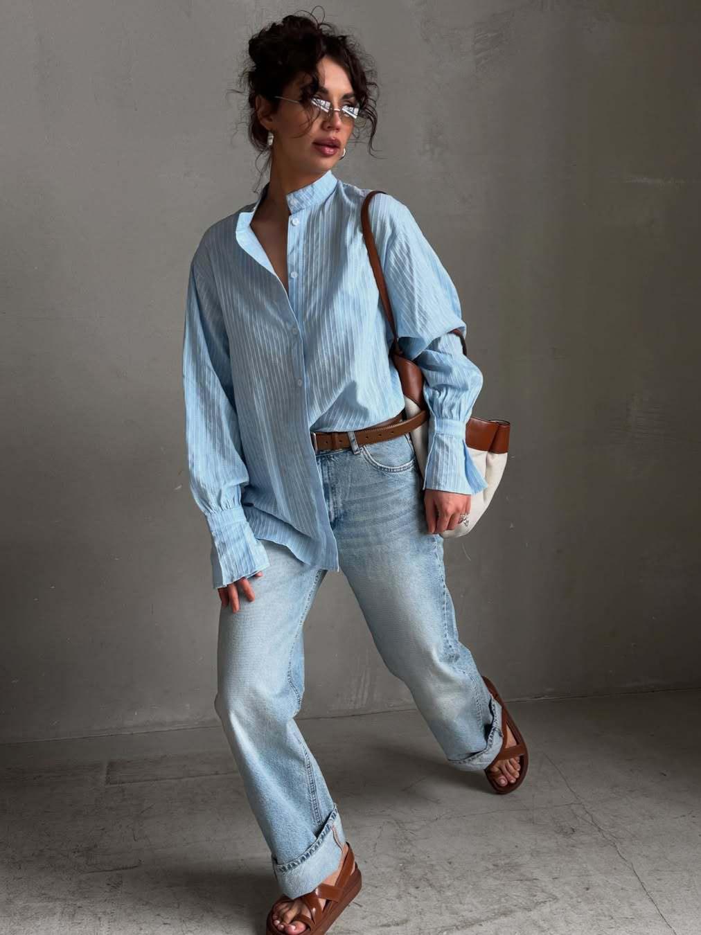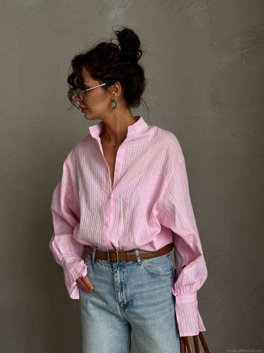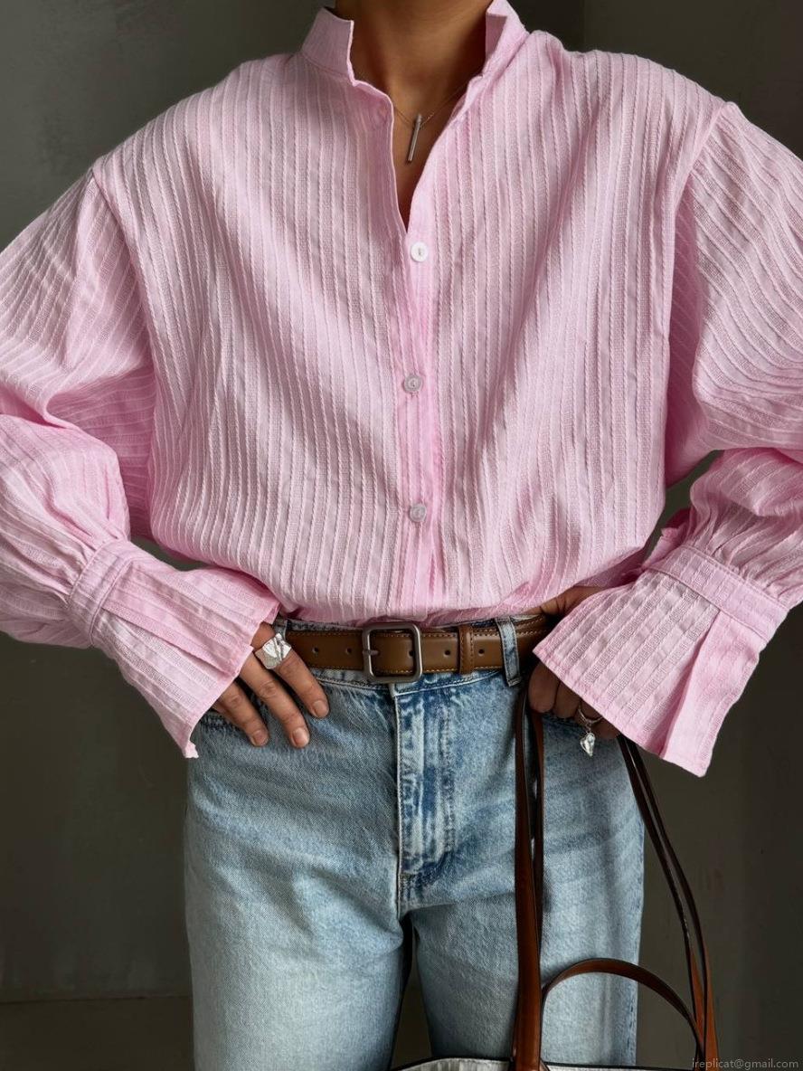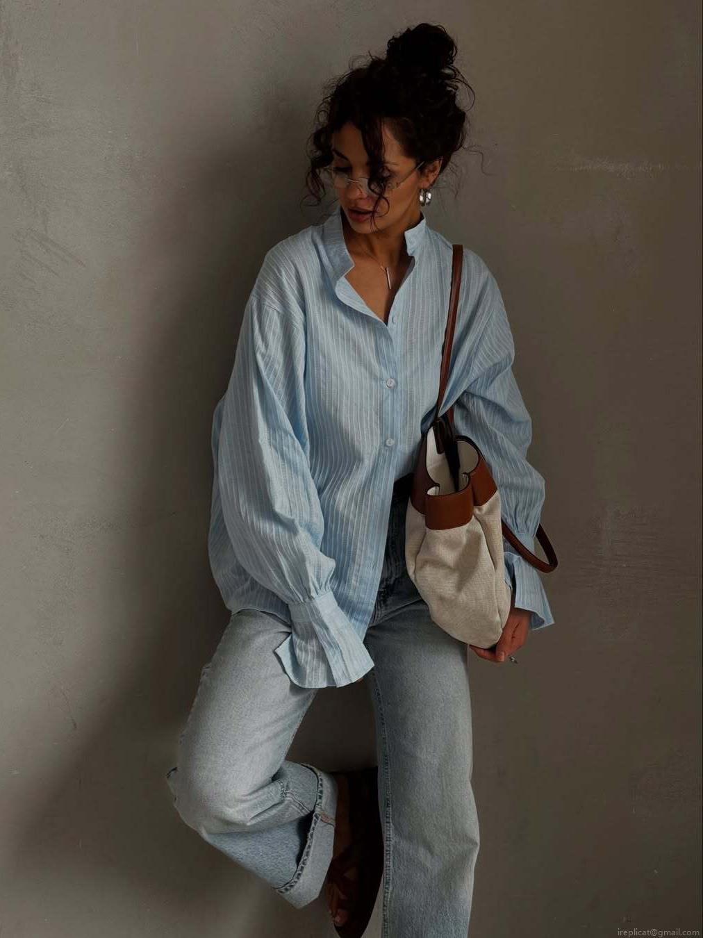• Women Striped Long Sleeve Blouse Cotton Blend Single Breasted Stand Collar Shirt Loose Fit Streetwear Minimalist Commuter Top Casual Button Up Blouse