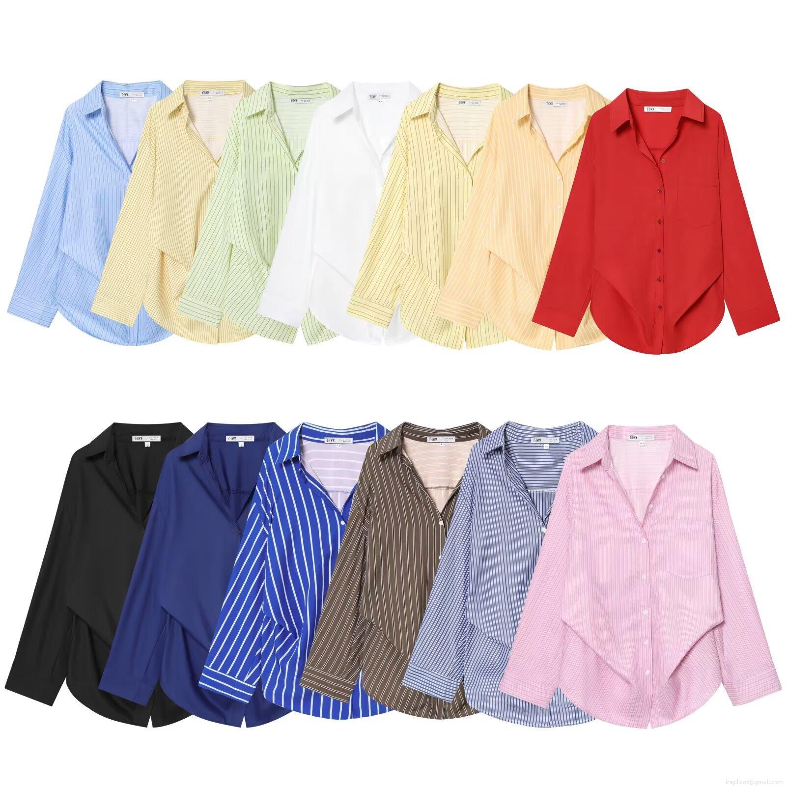 • Women Striped Long Sleeve Blouse Polyester Turn-Down Collar Shirt Office Commuting Casual Solid Color Top With Knot Hem For Ladies