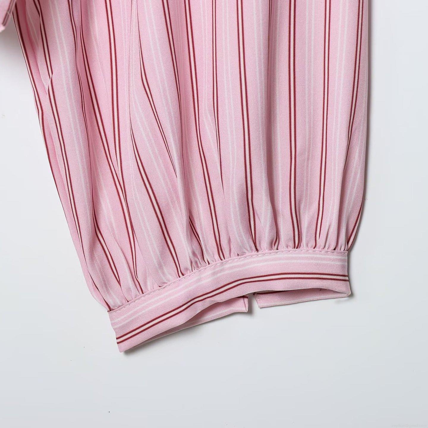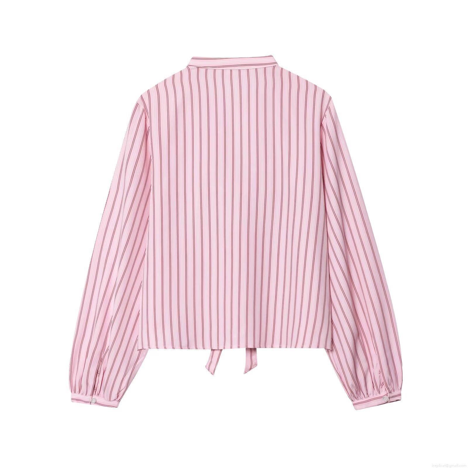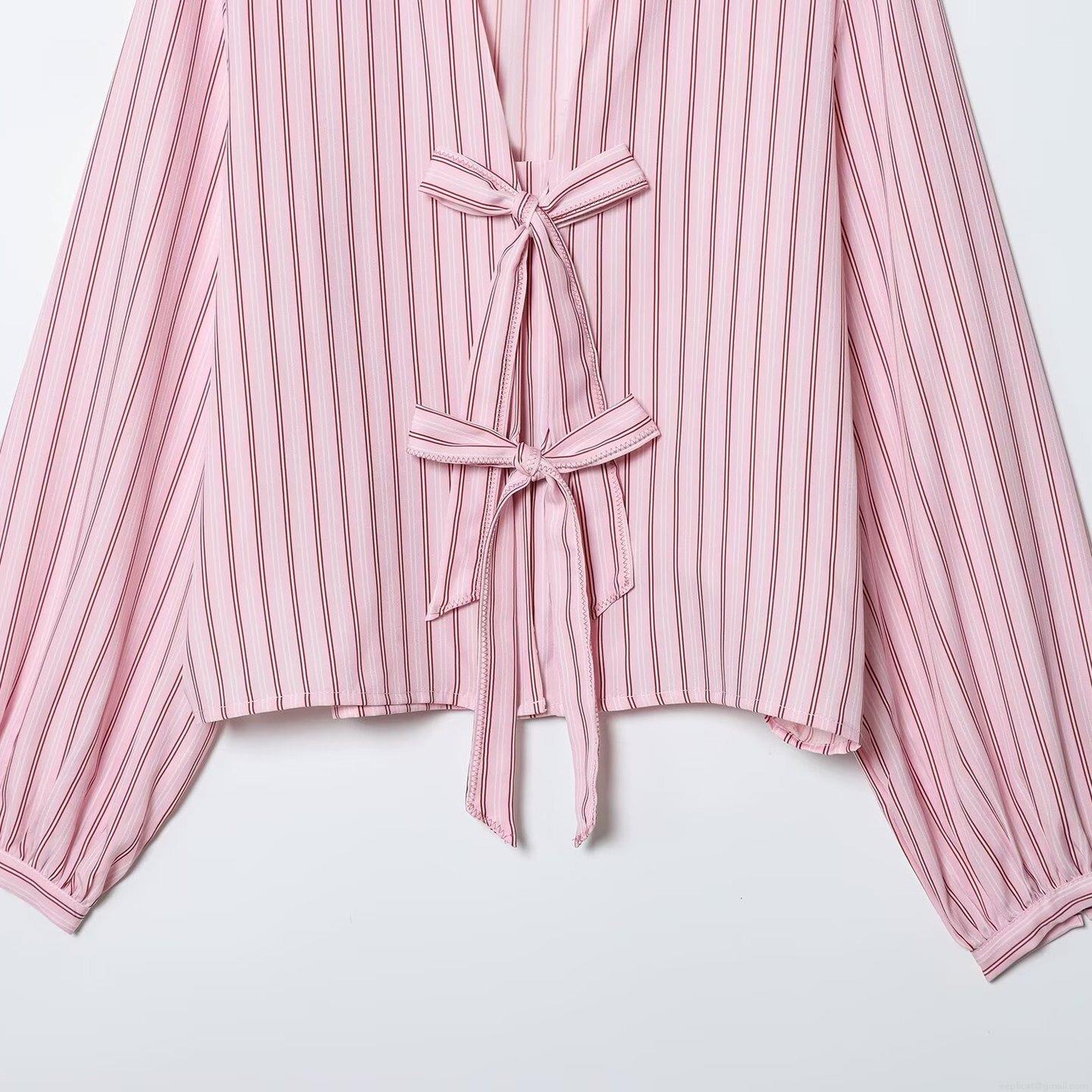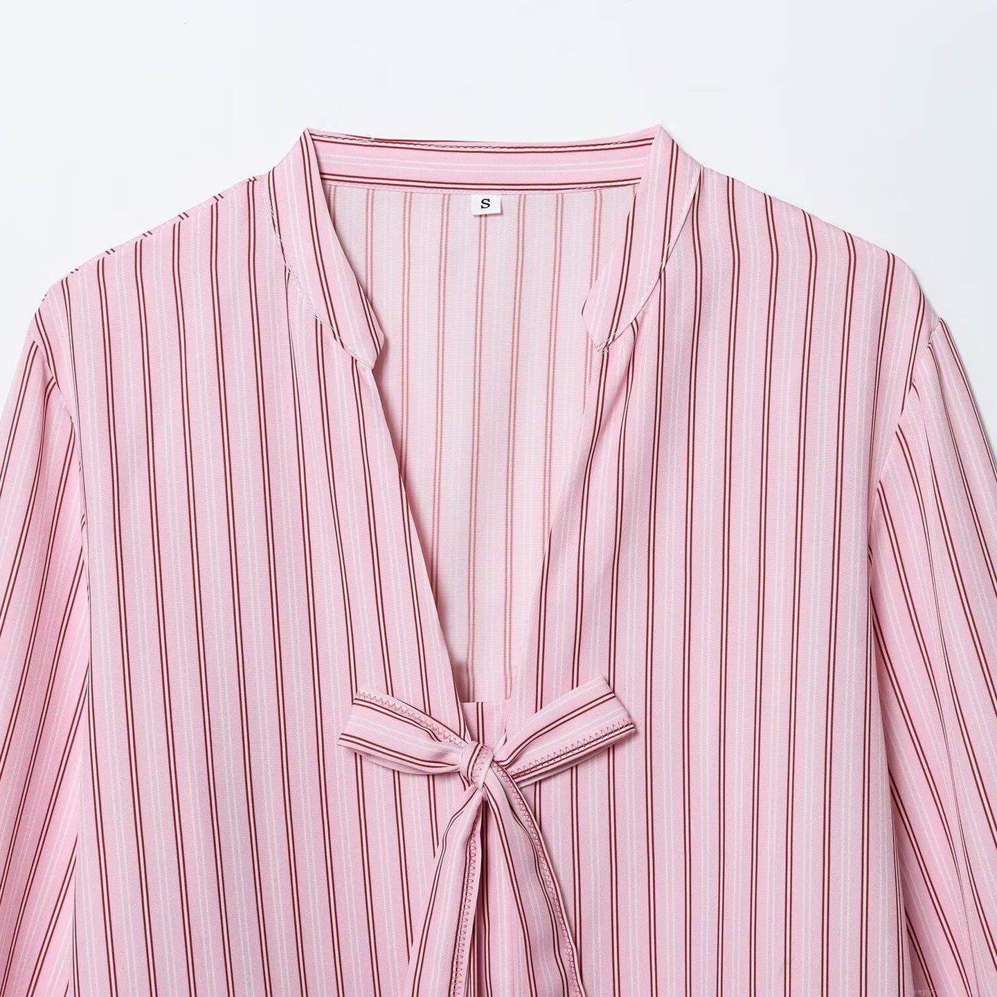 • Women Striped Long Sleeve Blouse With Bow Tie V-Neck Polyester Poplin Casual Shirt Autumn Fashion Tops For Ladies