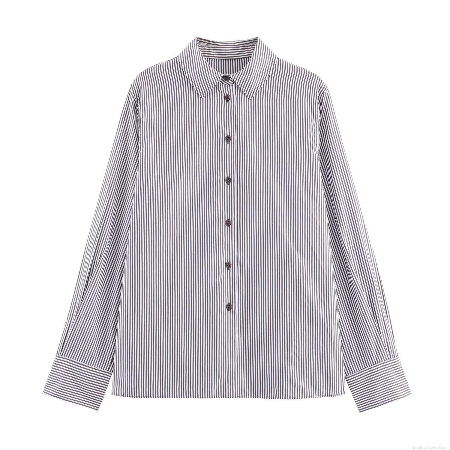 Women Striped Long Sleeve Shirt Polyester Poplin Button Down Casual Office Streetwear Blouse With Turn-down Collar For Ladies