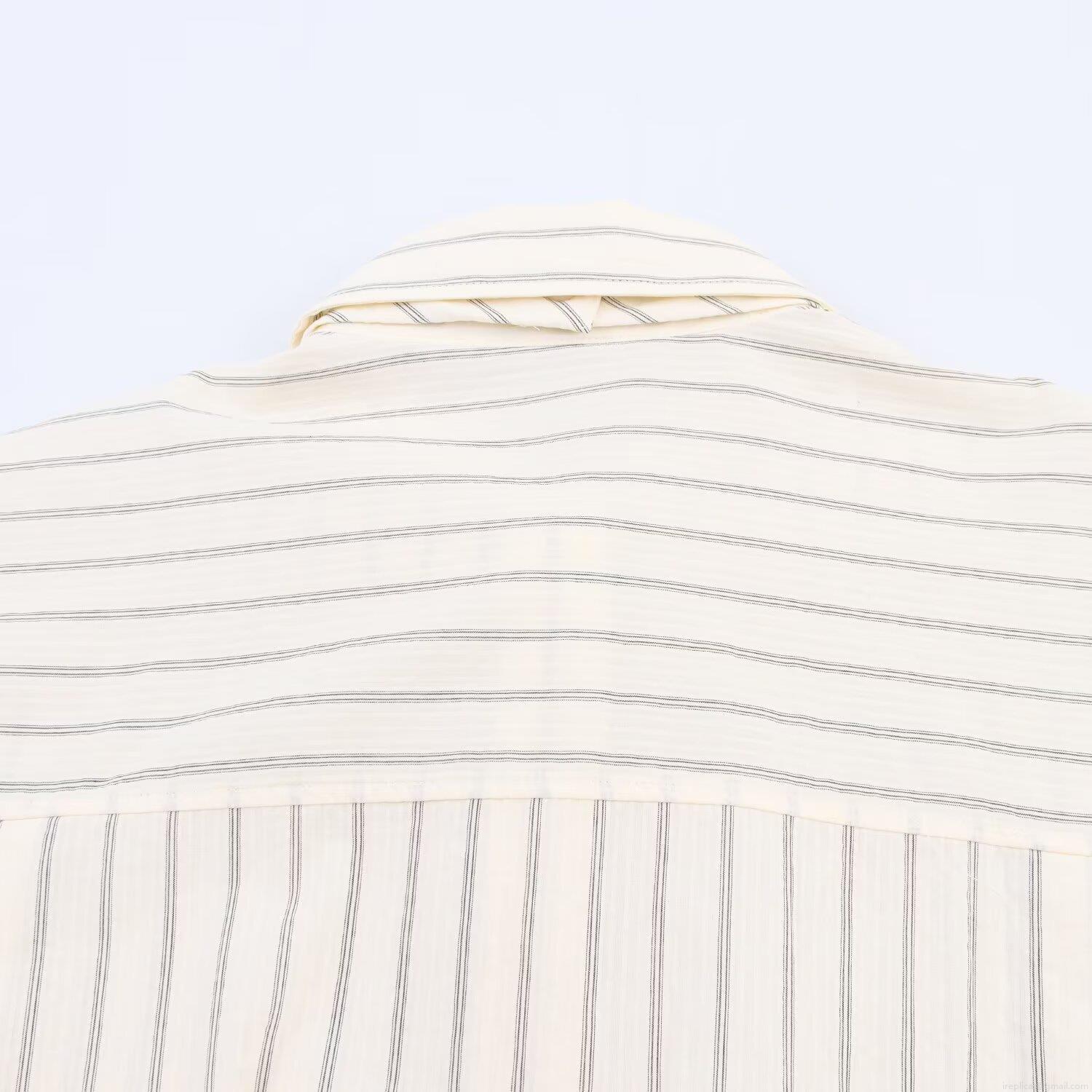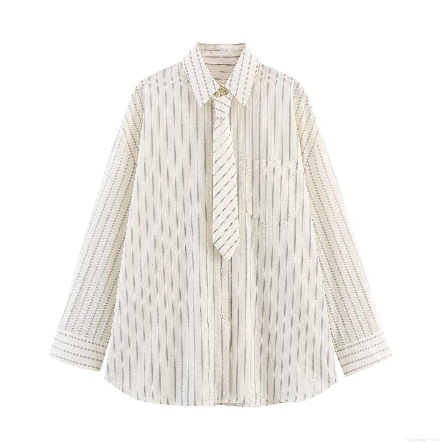 Women Striped Shirt With Matching Tie Long Sleeve Loose Fit Polyester Poplin Blouse Retro Academic Style Casual Office Ladies Tops