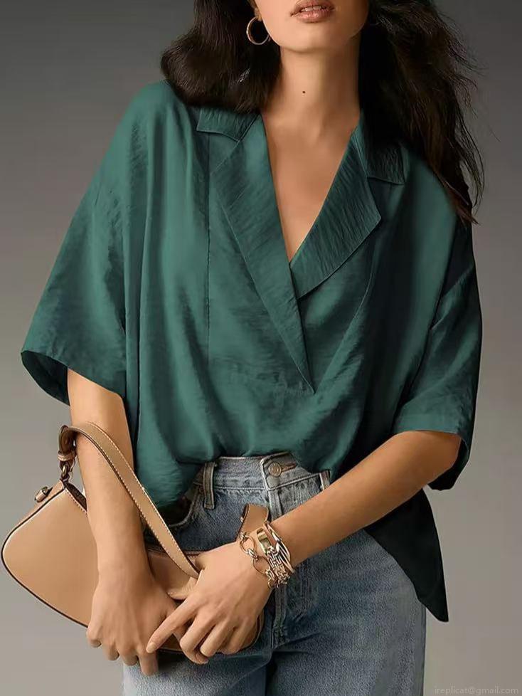 • Women Summer Short Sleeve Blouse Elegant Lapel V Neck Satin Silk Texture Loose Fit Casual Top Solid Color Pullover Shirt For Office Commute Ladies Fashion
