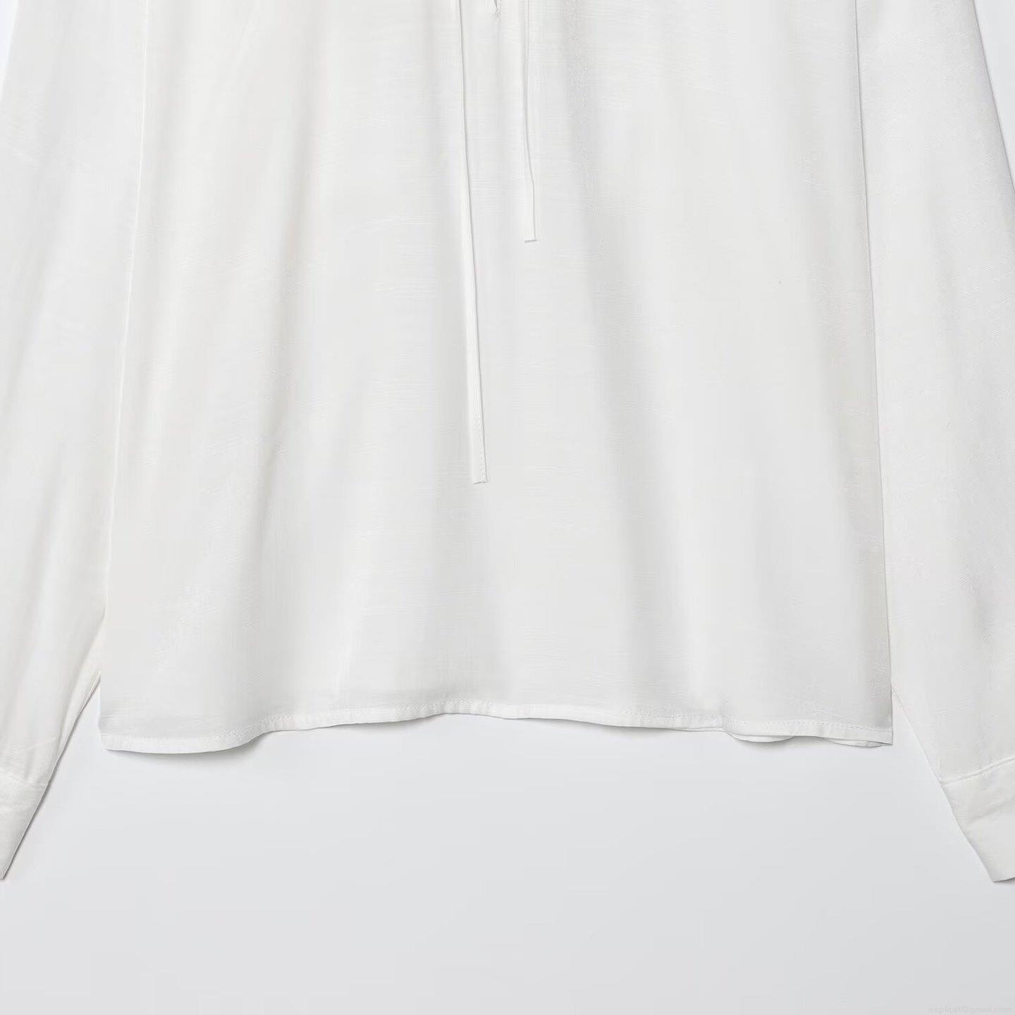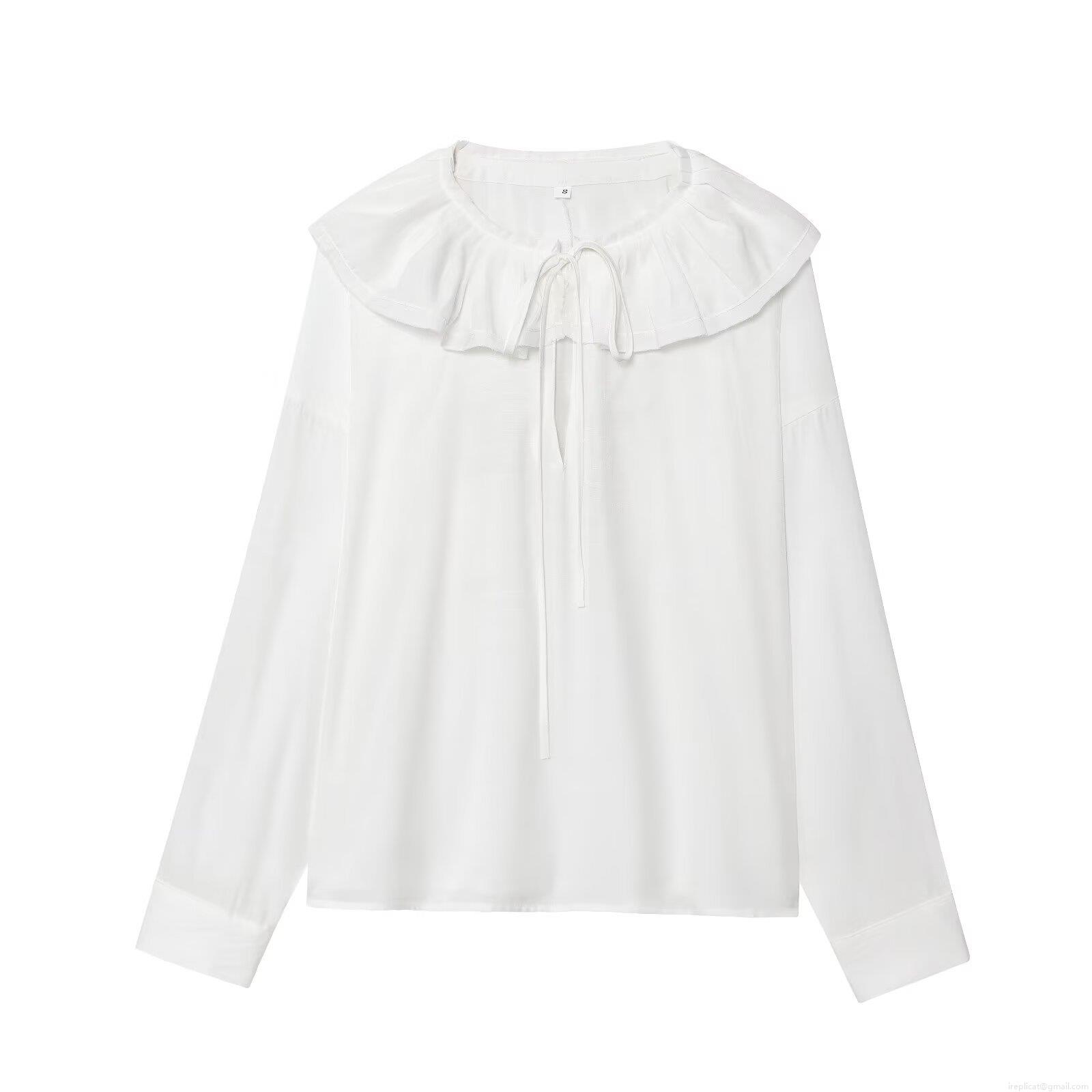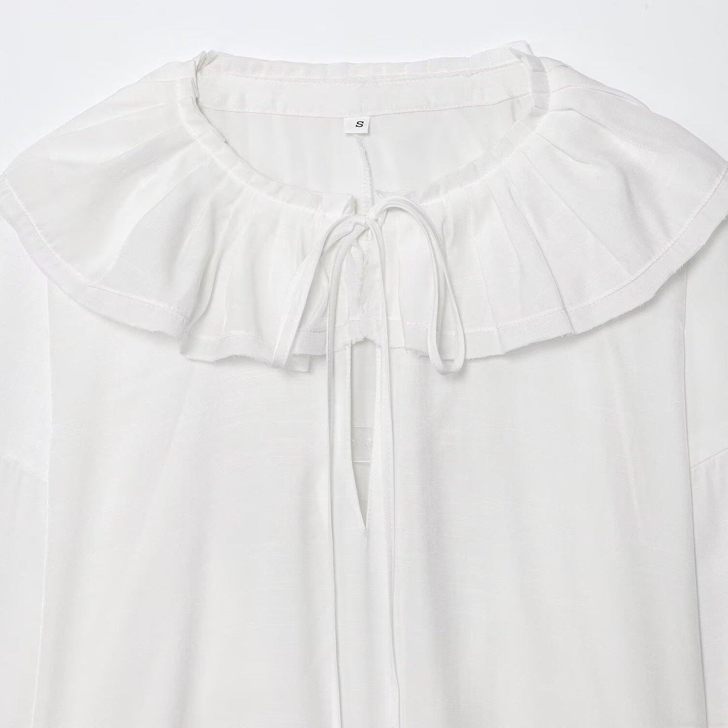 • Women Sweet Elegant Ruffle Peter Pan Collar Blouse Slub Cotton Polyester Blend Long Sleeve Solid Color Button Down Tie Front Shirt For Women