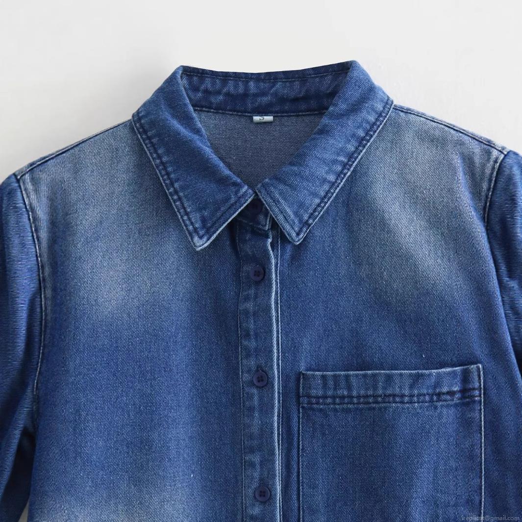 • Women Sweet Long Sleeve Denim Style Shirt Vintage Blue Water Washing Button Down Blouse Casual Daily Wear Top Polyester Fabric Shirt For Ladies