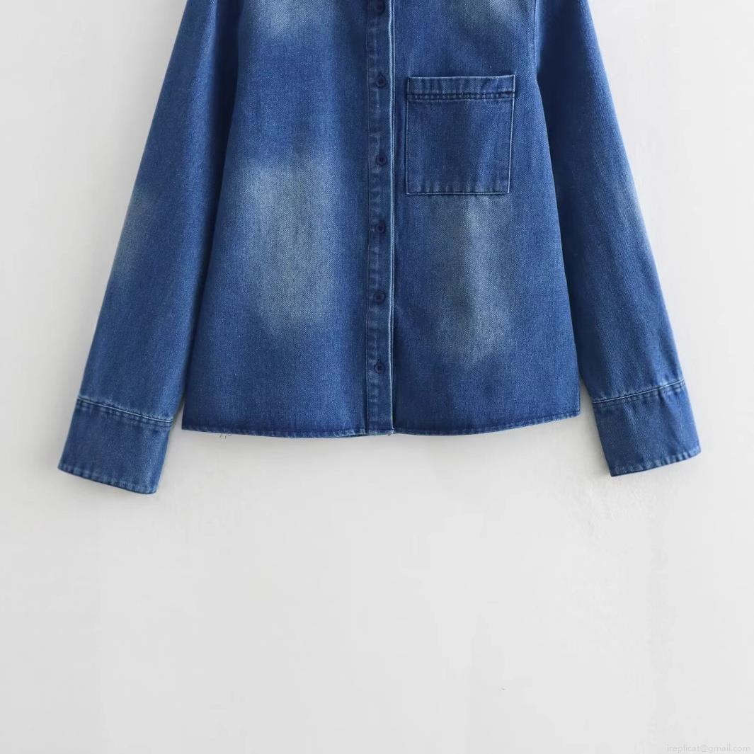 Women Sweet Long Sleeve Denim Style Shirt Vintage Blue Water Washing Button Down Blouse Casual Daily Wear Top Polyester Fabric Shirt For Ladies