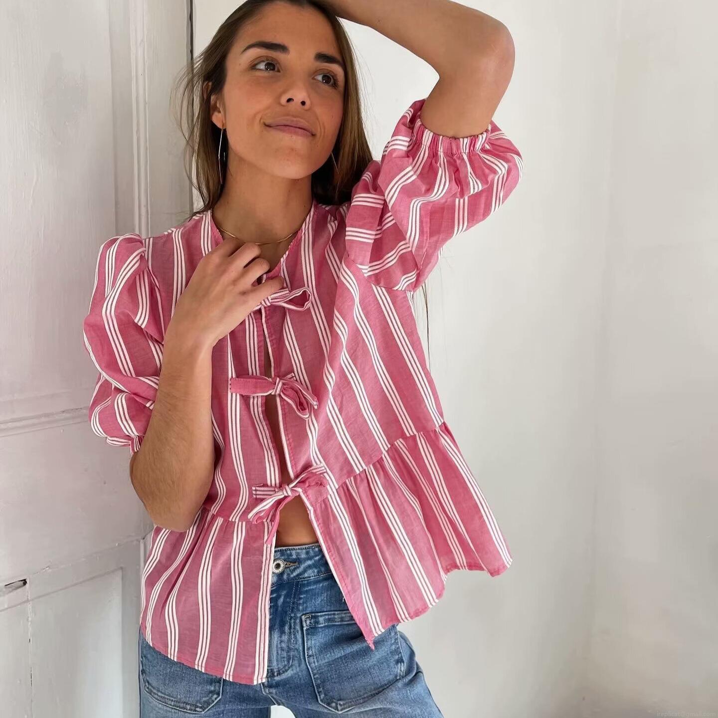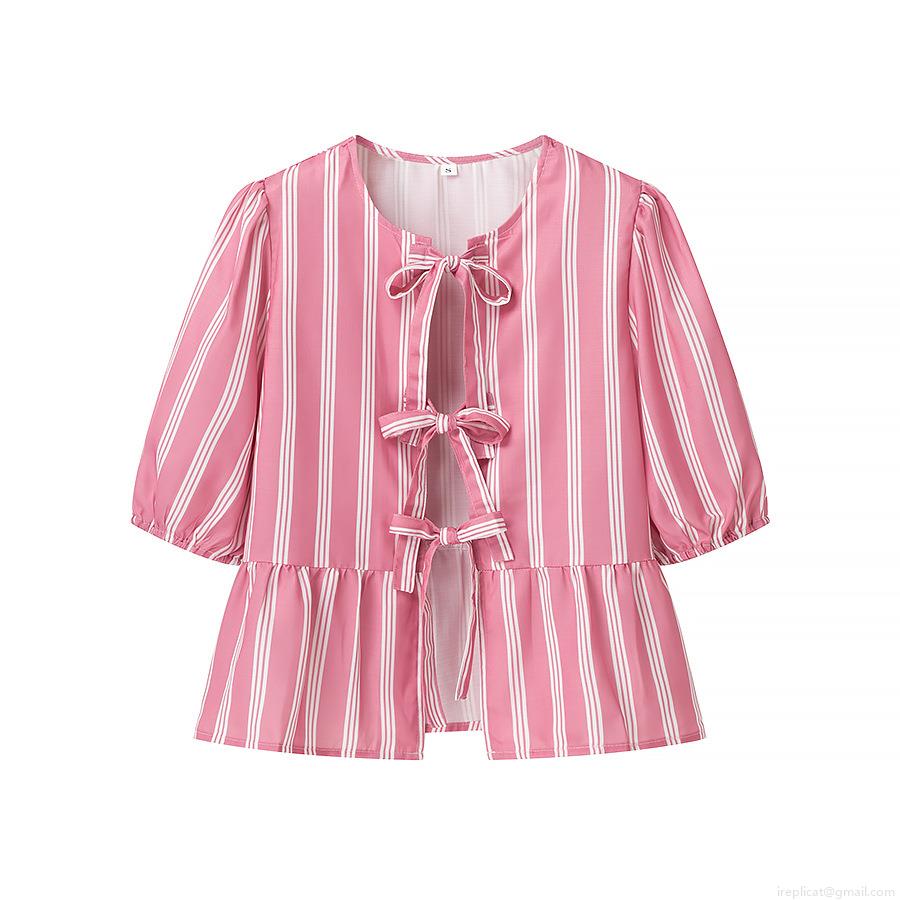 Women Sweet Puff Sleeve Ribbon Bowtie Blouse Striped Leopard Print Ruffle Hem Short Sleeve Top For Teen Girls Ladies Casual Summer Shirts