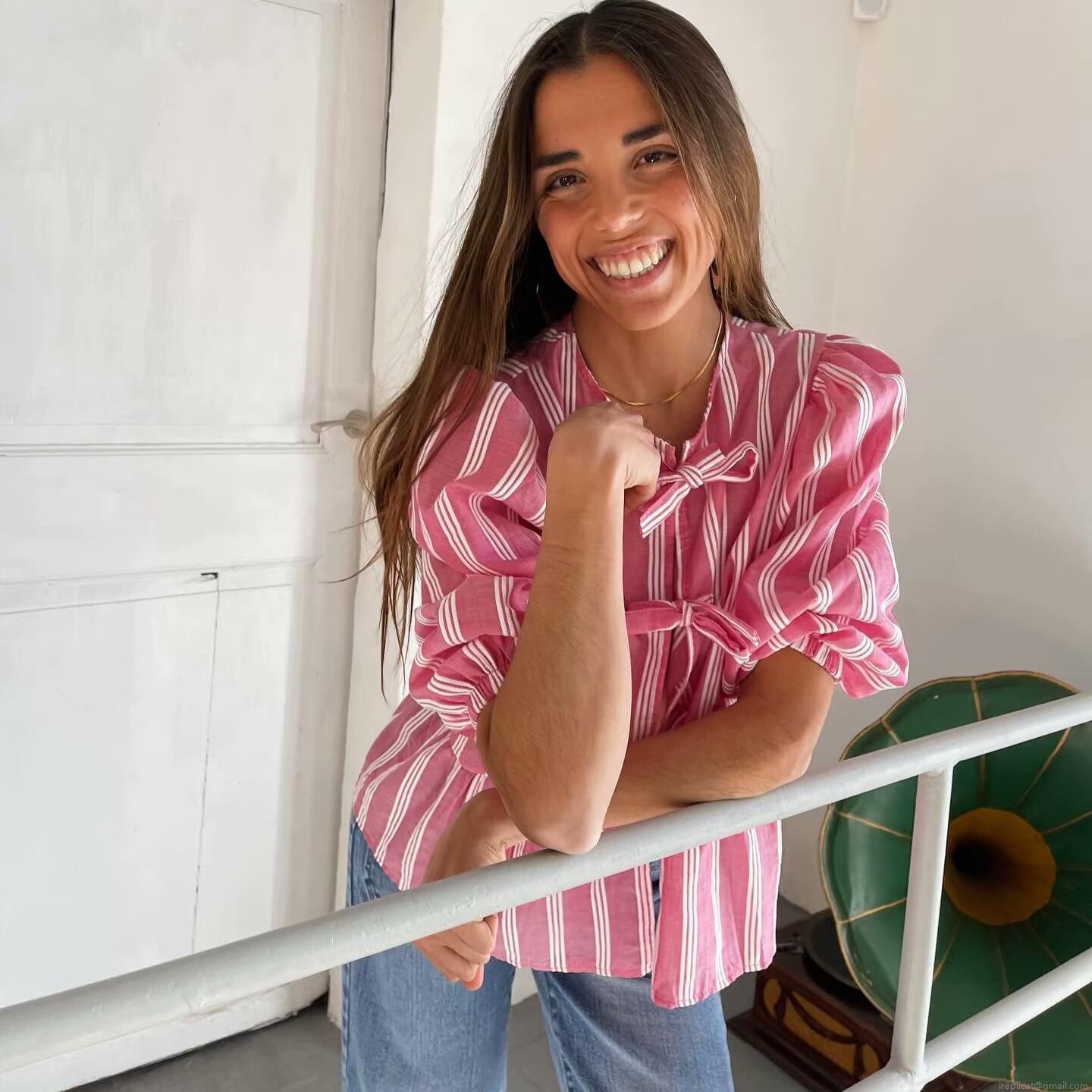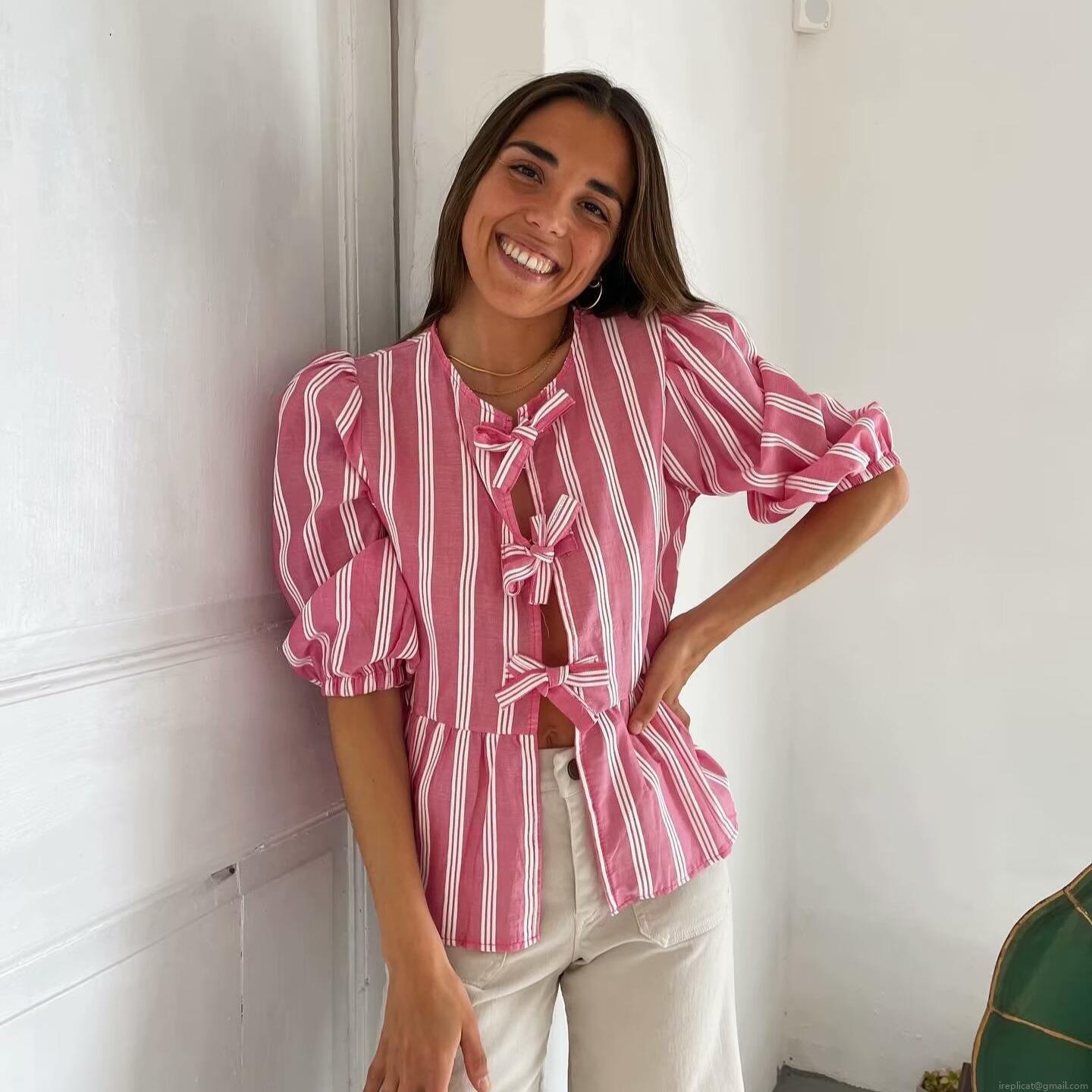• Women Sweet Puff Sleeve Ribbon Bowtie Blouse Striped Leopard Print Ruffle Hem Short Sleeve Top For Teen Girls Ladies Casual Summer Shirts