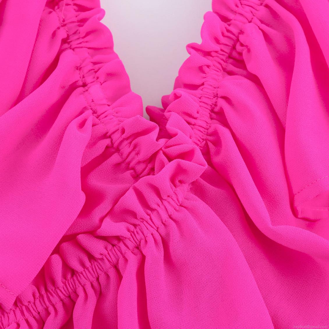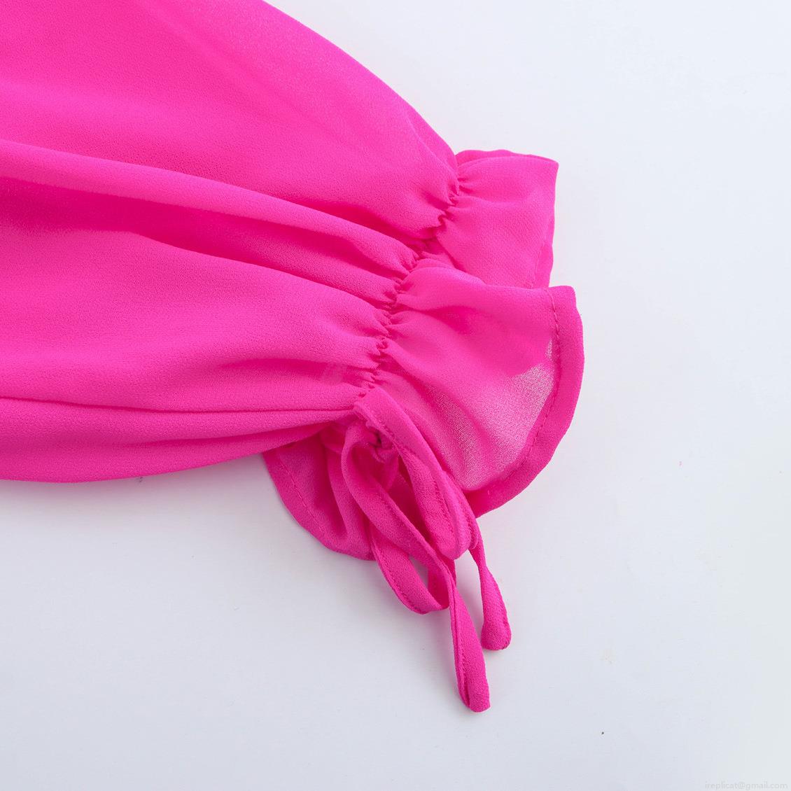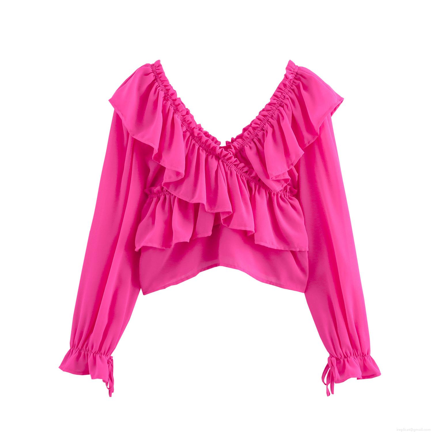• Women Sweet Ruffle V Neck Off Shoulder Chiffon Blouse Elegant Rose Red Long Sleeve Tie Cuff Short Shirt Top Female Summer Fashion Clothing