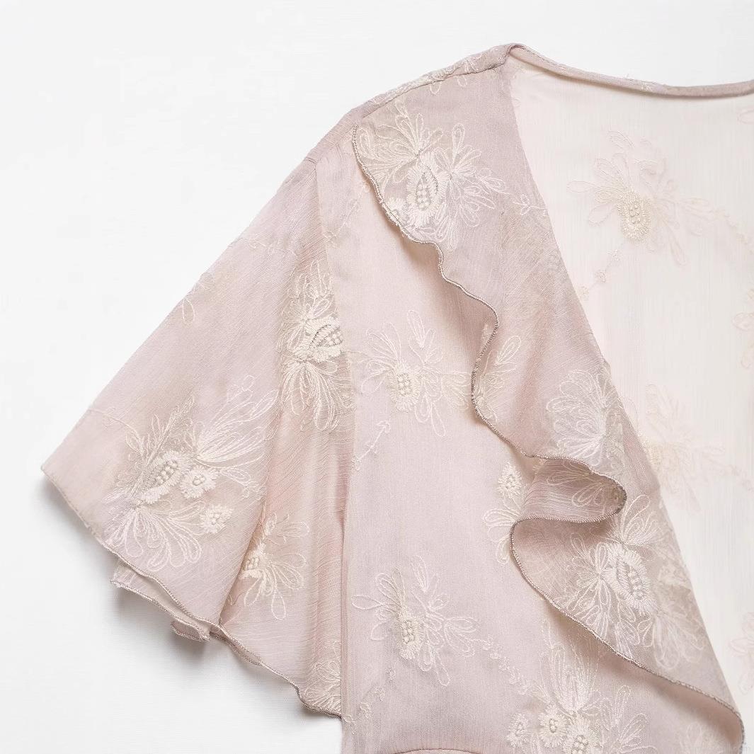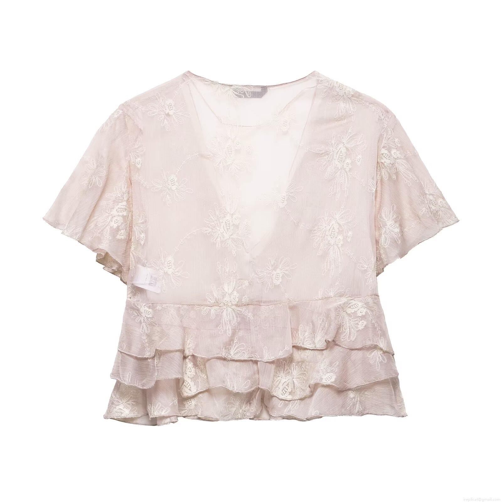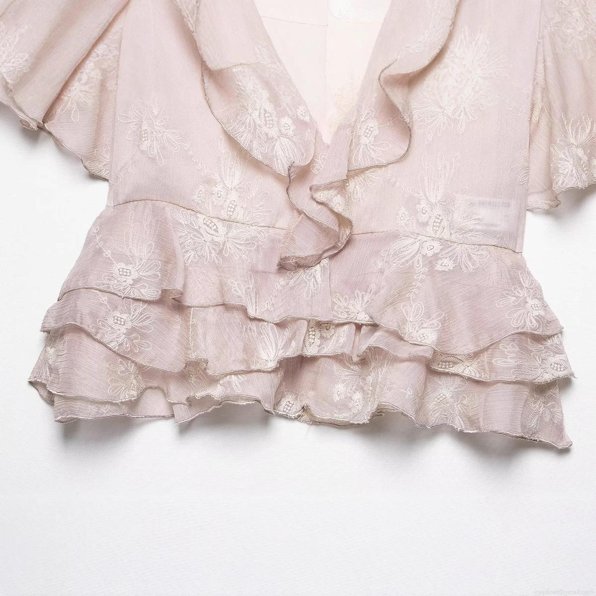 • Women Sweet V Neck Chiffon Blouse Tiered Ruffle Hem Flower Embroidered Top Short Flutter Sleeve Light Pink Embroidery Shirt For Daily Dating Summer