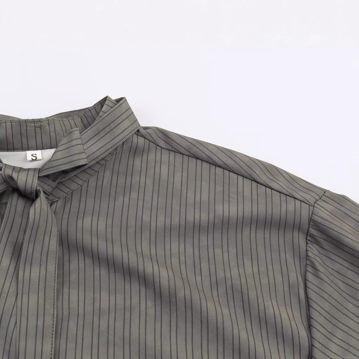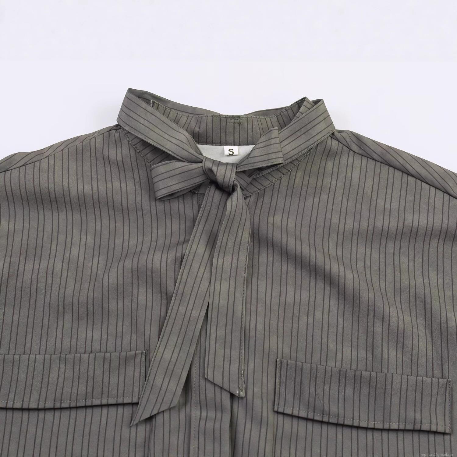 • Women Vertical Stripe Long Sleeve Shirt With Bow Tie Neck Polyester Spandex Blouse Double Pockets Office Elegant Casual Fashion Top