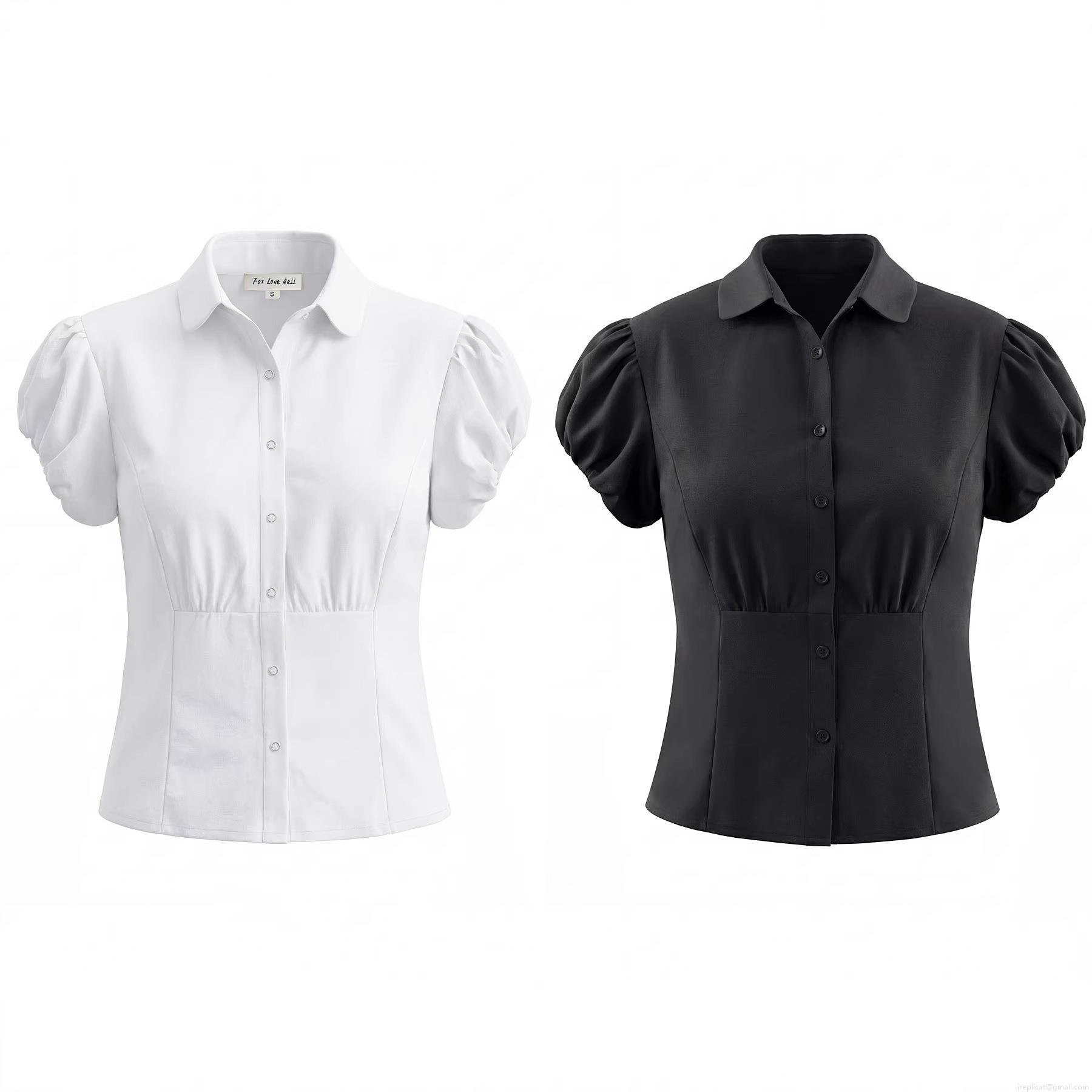 • Women Vintage Bubble Sleeve Shirt Slim Fit Waist Pleated Lapel Single Breasted Short Sleeve Cotton Blend Blouse For Casual Daily Wear