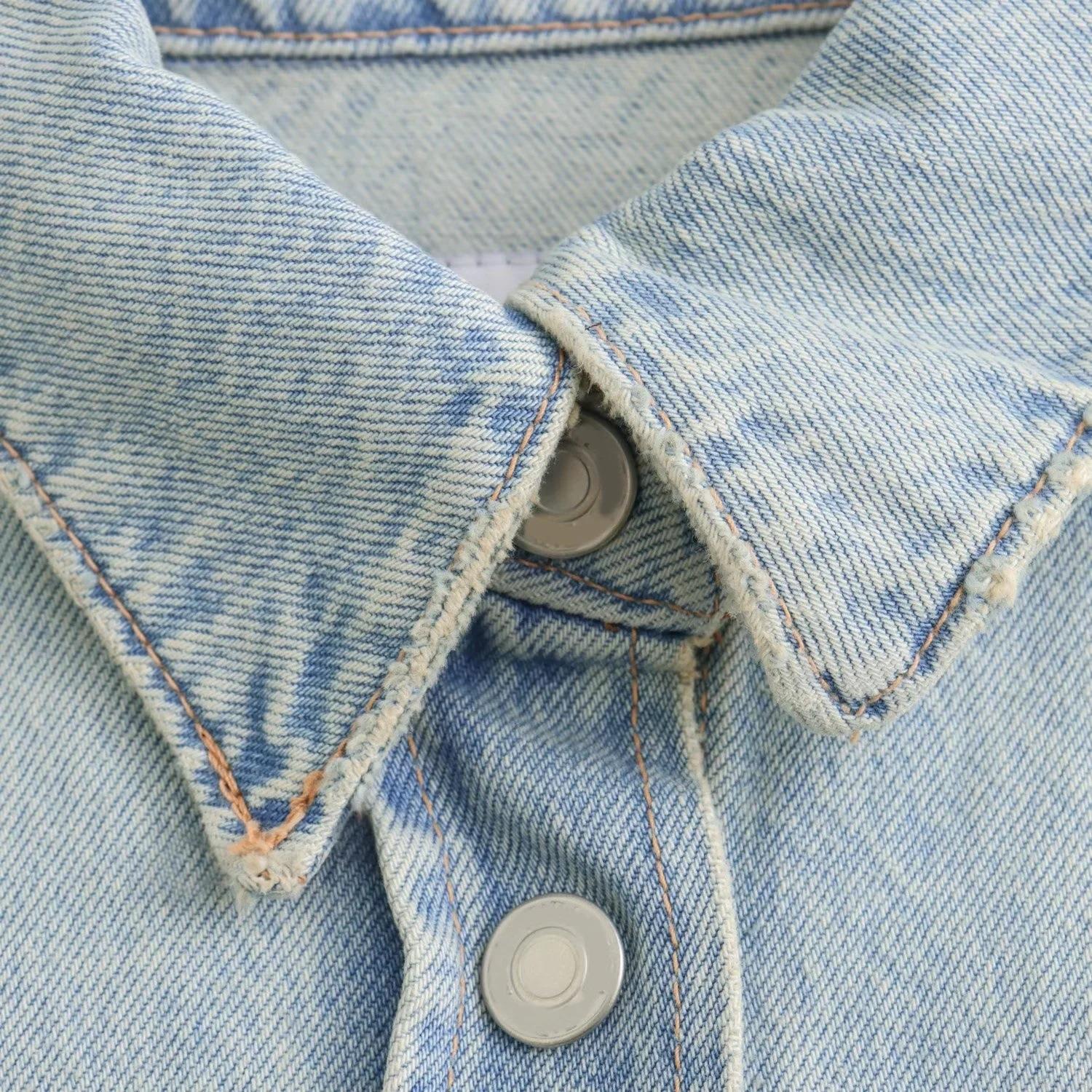 Women Vintage Light Blue Denim Shirt Loose Long Sleeve Washed Cotton Blouse With Single Breasted Pockets Casual Fashion Raw Hem Jean Jacket Tops For Women