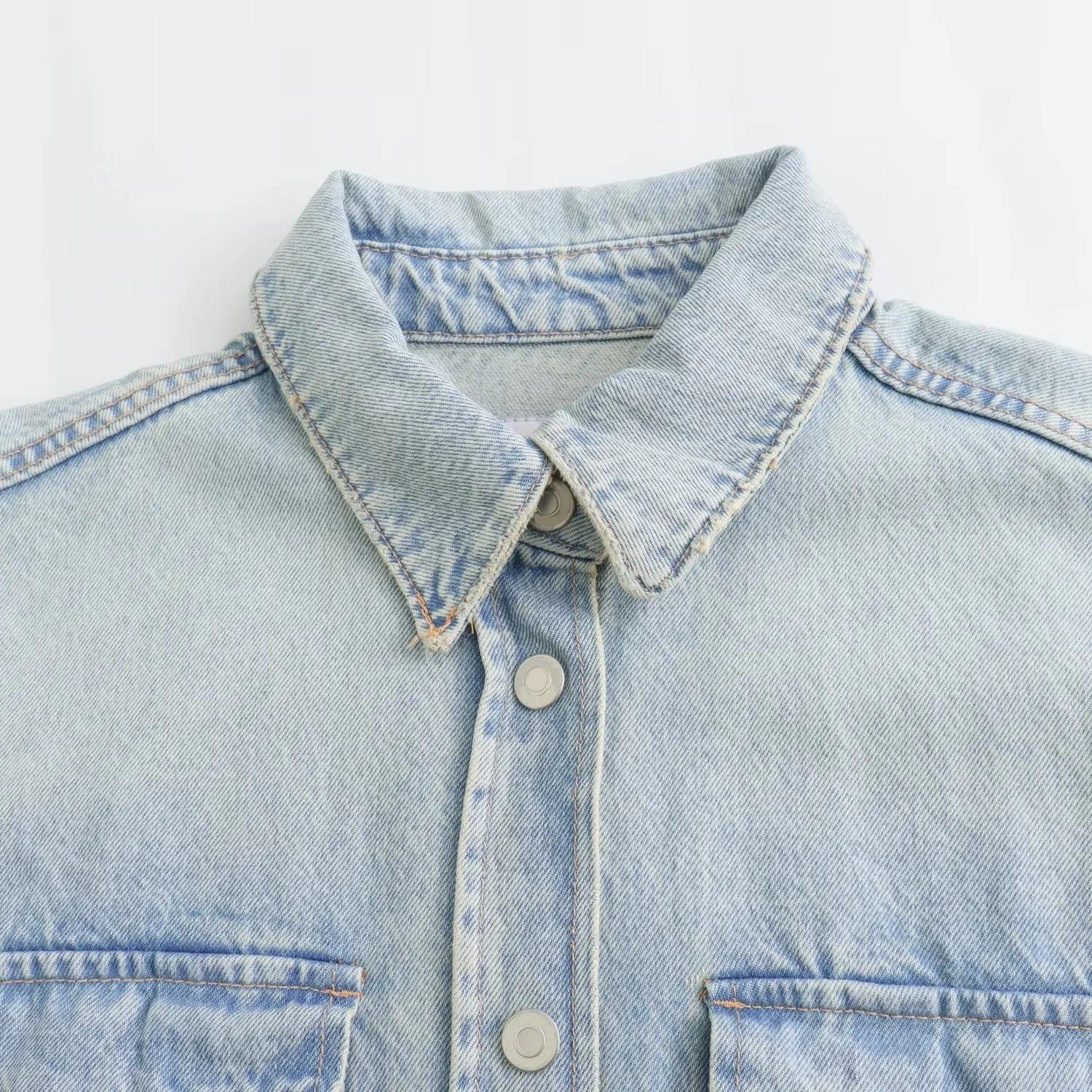 • Women Vintage Light Blue Denim Shirt Loose Long Sleeve Washed Cotton Blouse With Single Breasted Pockets Casual Fashion Raw Hem Jean Jacket Tops For Women