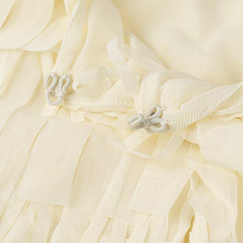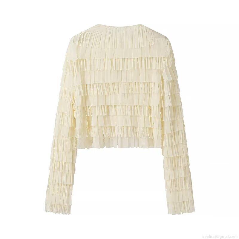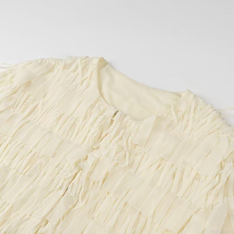 • Women Western Style Fringe Layered Blouse Round Neck Long Sleeve Cropped Cardigan Sweet Solid Color Polyester Top For Lady