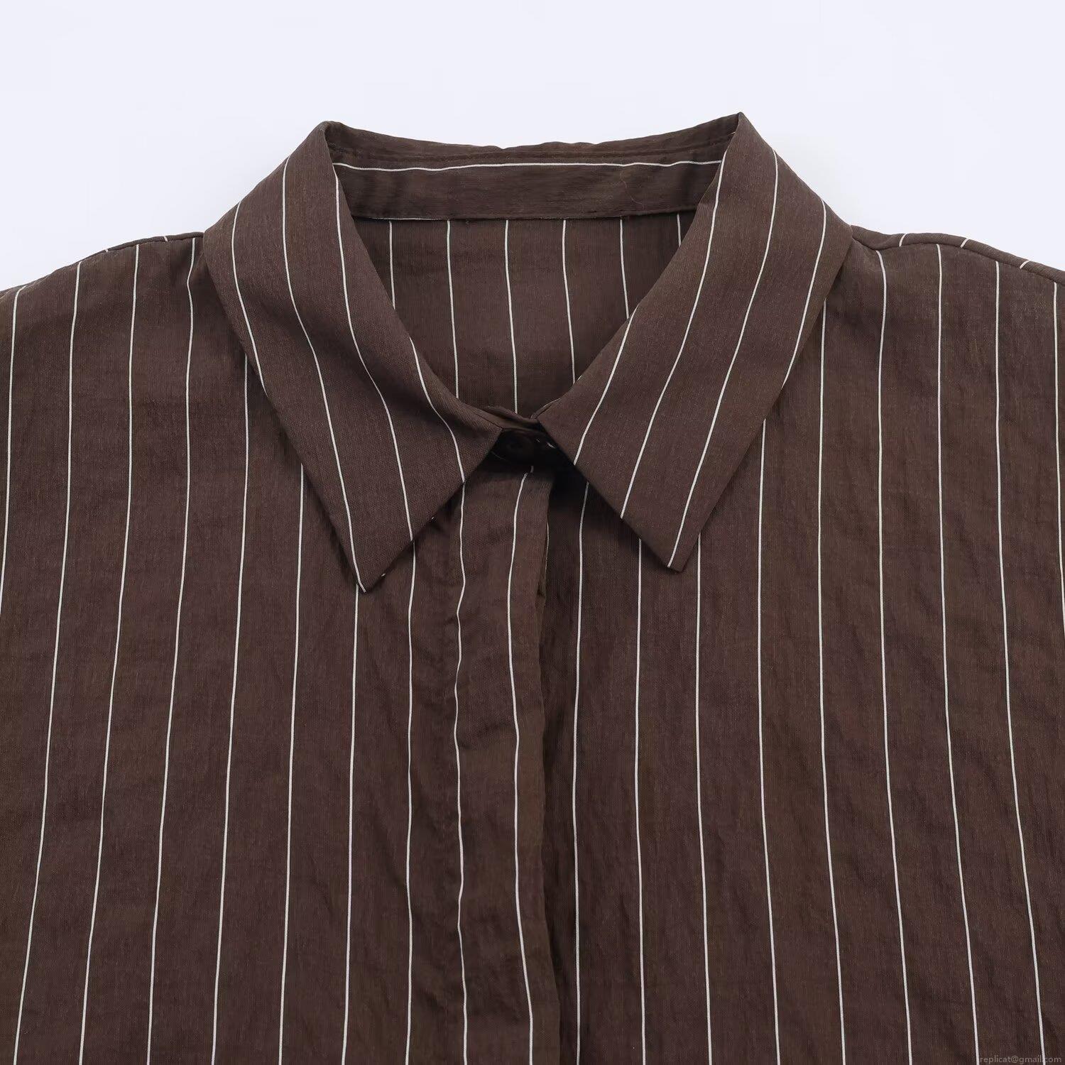 Women Western Style Lapel Long Sleeve Striped Poplin Shirt With Double Buckle Belt Detail Streetwear Loose Casual Blouse Top Deep Brown