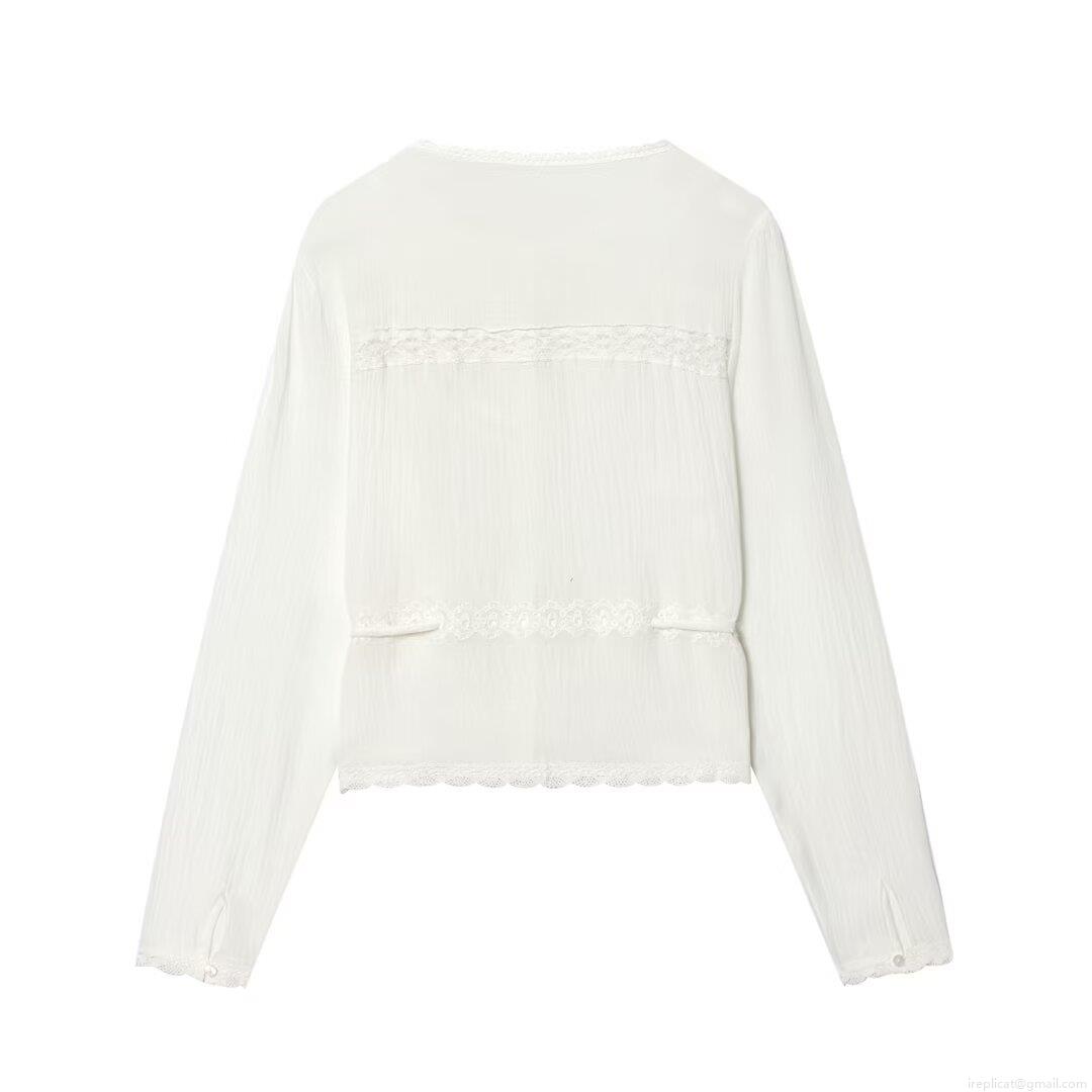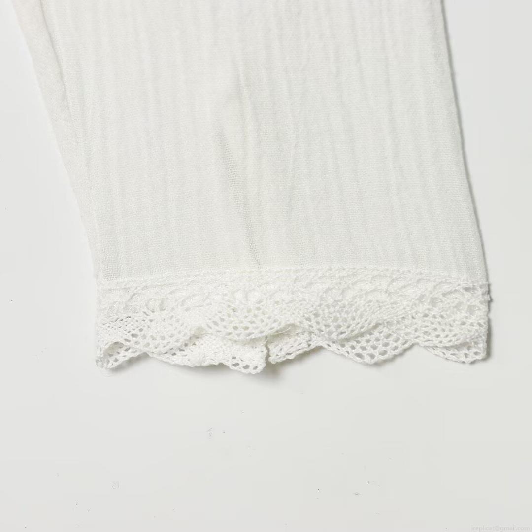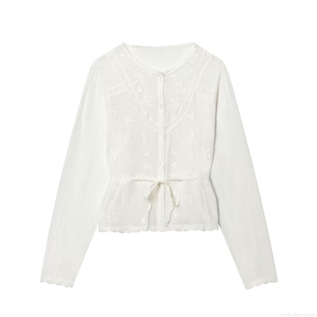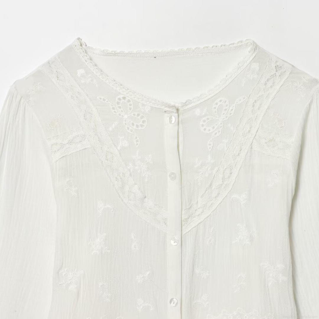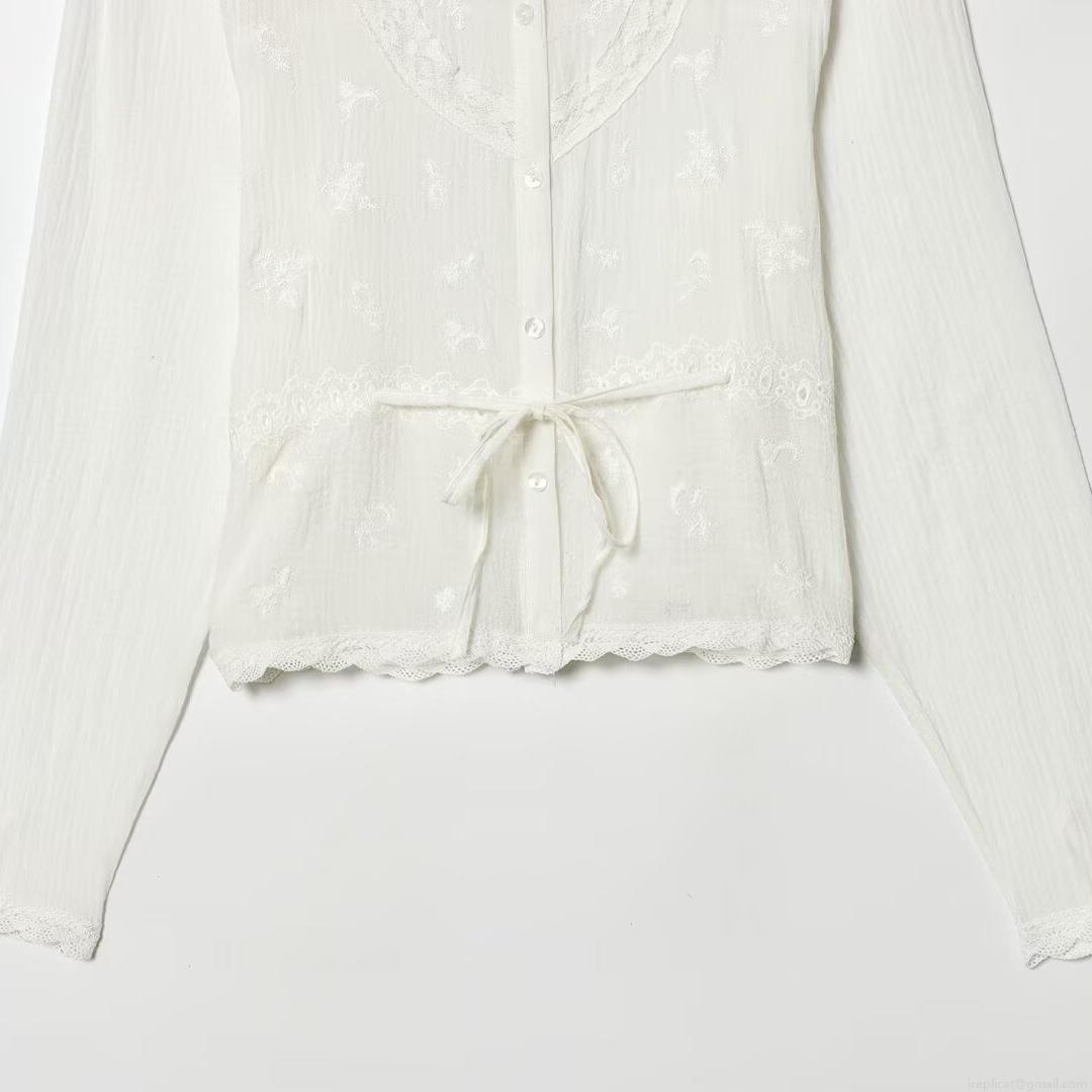 • Women White Lace Embroidered Long Sleeve Blouse Elegant Floral Embroidery Button Up Shirt With Drawstring Waist Sweet French Style Casual Tops