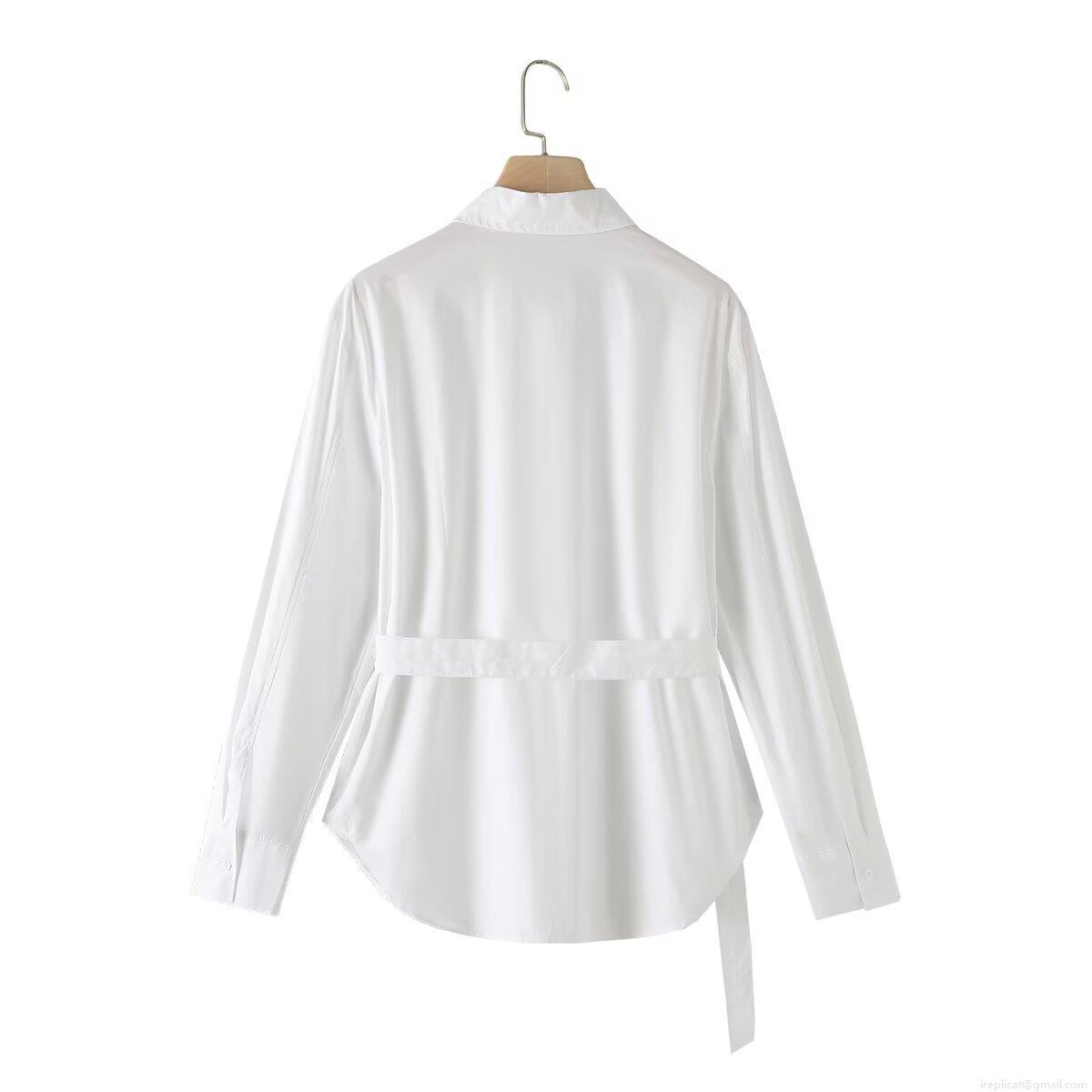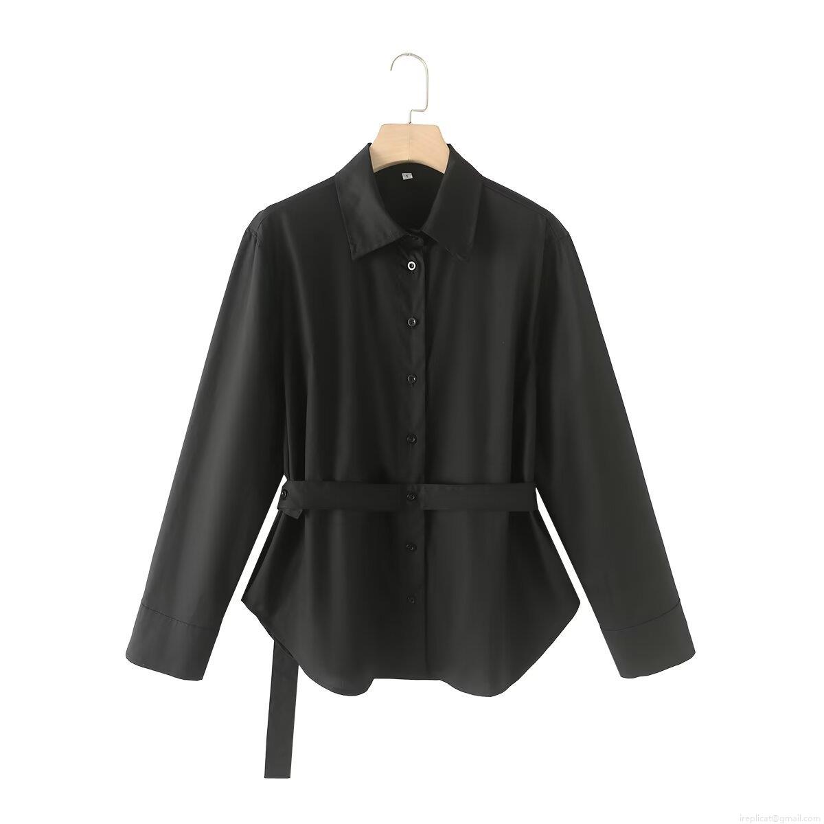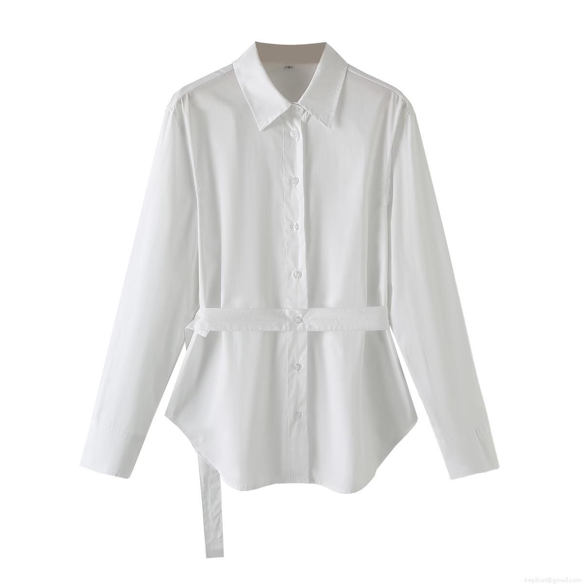 • Women's 100% Cotton Poplin Shirt With Waist Tie Belt Long Sleeve Button Down Blouse Minimalist Office Streetwear Casual Solid Top