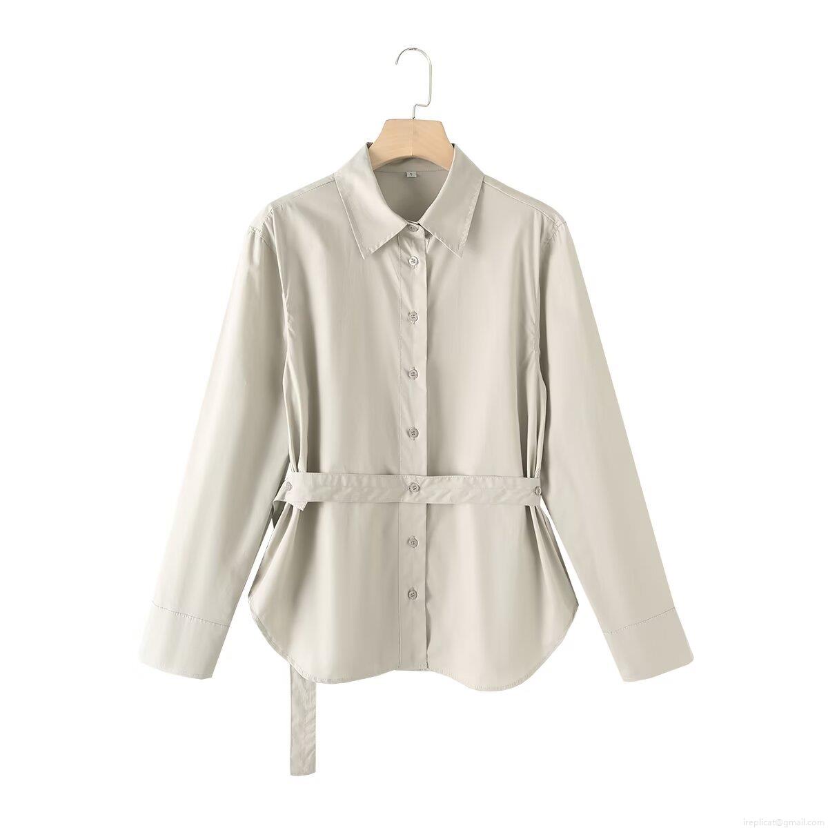 Women's 100% Cotton Poplin Shirt With Waist Tie Belt Long Sleeve Button Down Blouse Minimalist Office Streetwear Casual Solid Top