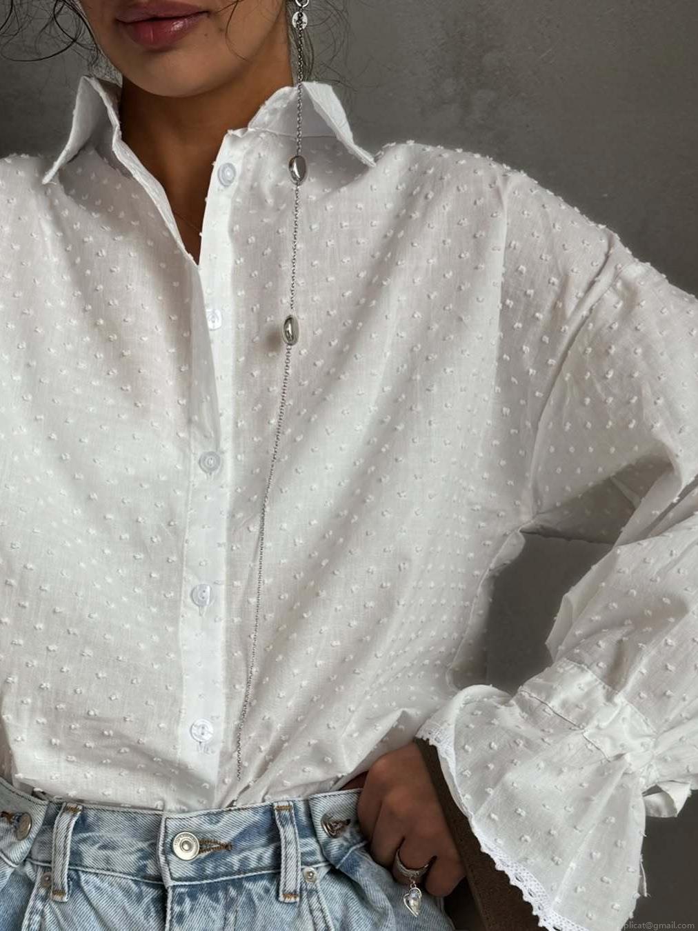 • Women's 100% Cotton White Swiss Dot Blouse Long Sleeve Button Down Shirt with Lace Cuff Flare Sleeves Casual Elegant Tops for Spring Autumn