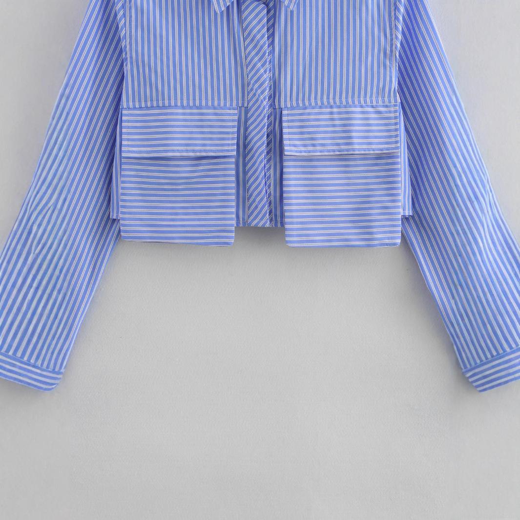• Women's 100% Polyester Blue and White Vertical Striped Long Sleeve Crop Shirt Fashion Button Down Blouse with Dual Pockets for Spring Autumn Streetwear Casual Style