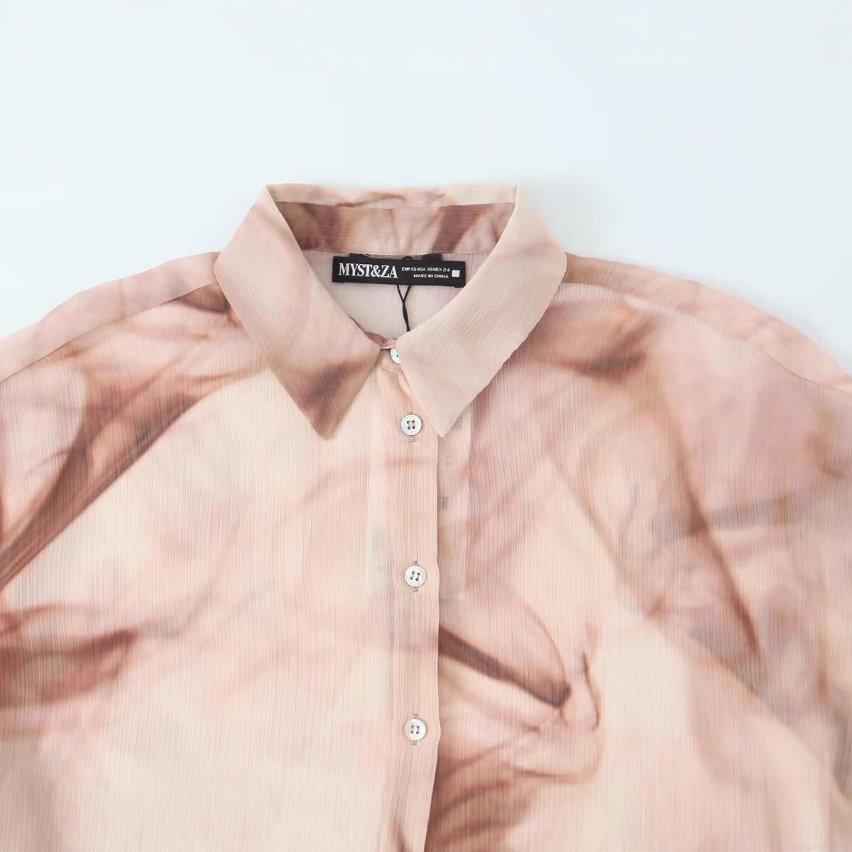 Women's Abstract Smoke Print Chiffon Blouse Long Sleeve Lapel Button Down Shirt Loose Fit Vertical Texture Streetwear Casual Lightweight Top