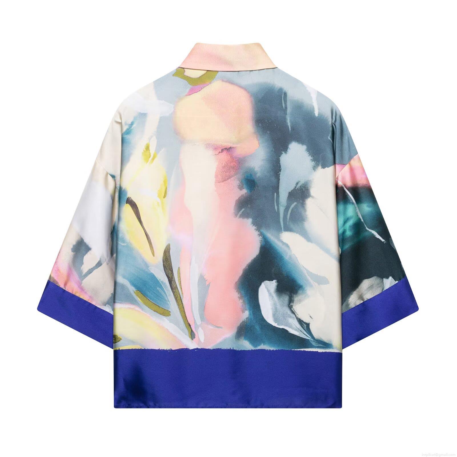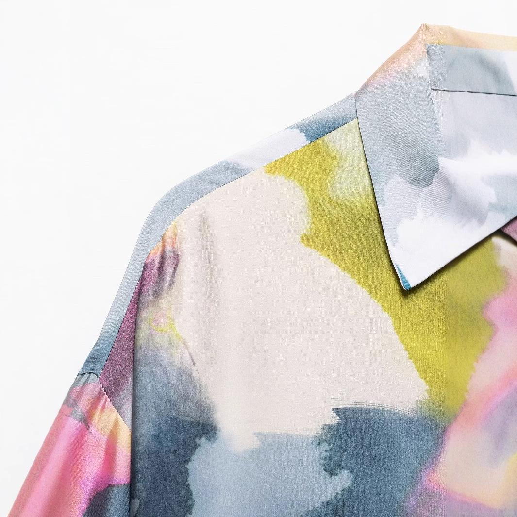 Oil Painting Printing, Splicing Design, Satin Finish, Abstract Watercolor, Dropped Shoulder Sleeves, Metallic Placket Button