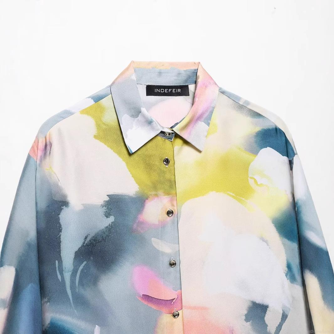 • Women's Abstract Watercolor Print Satin Blouse Elegant Silk Feel Button Down Loose Shirt Top With Metal Buttons For Ladies Office Party Casual