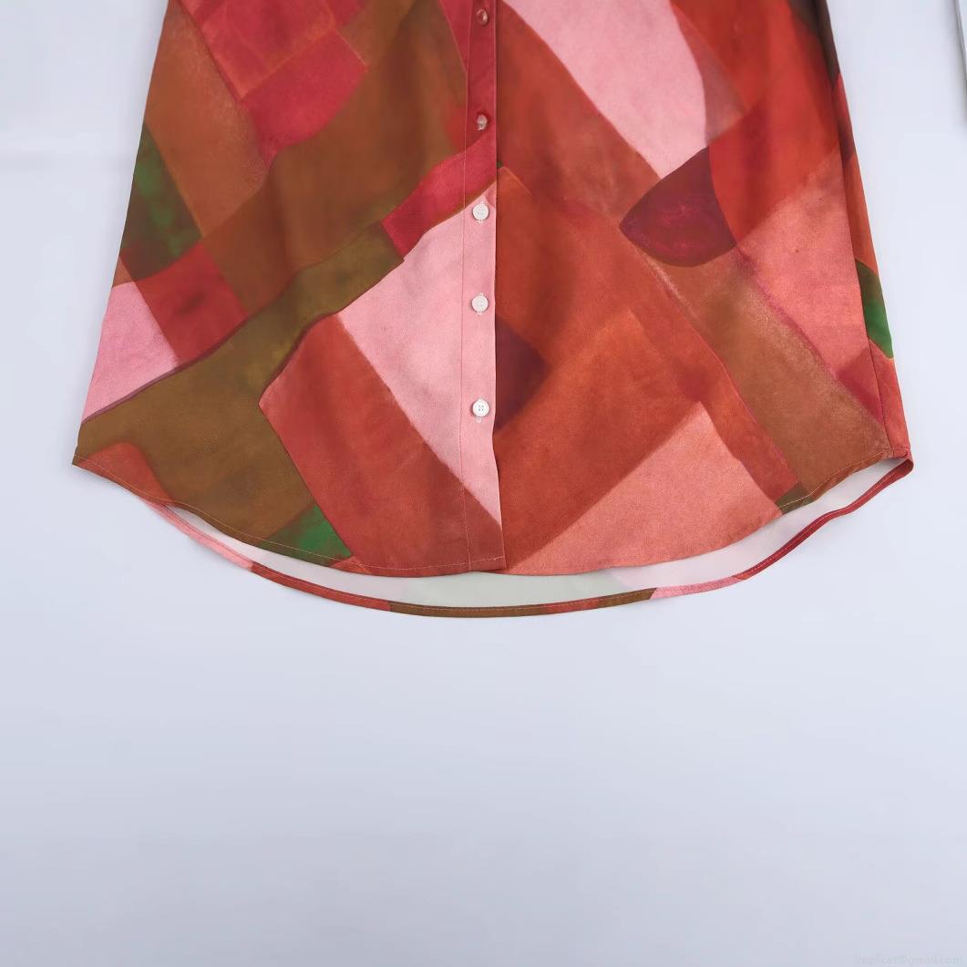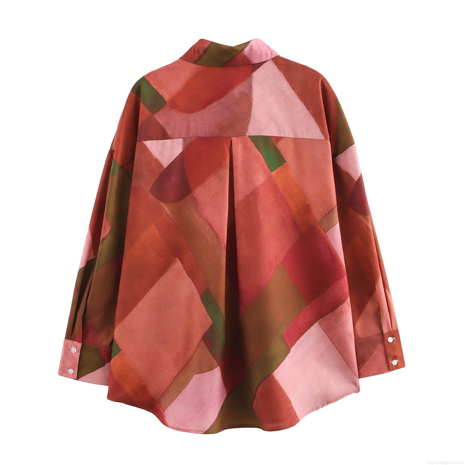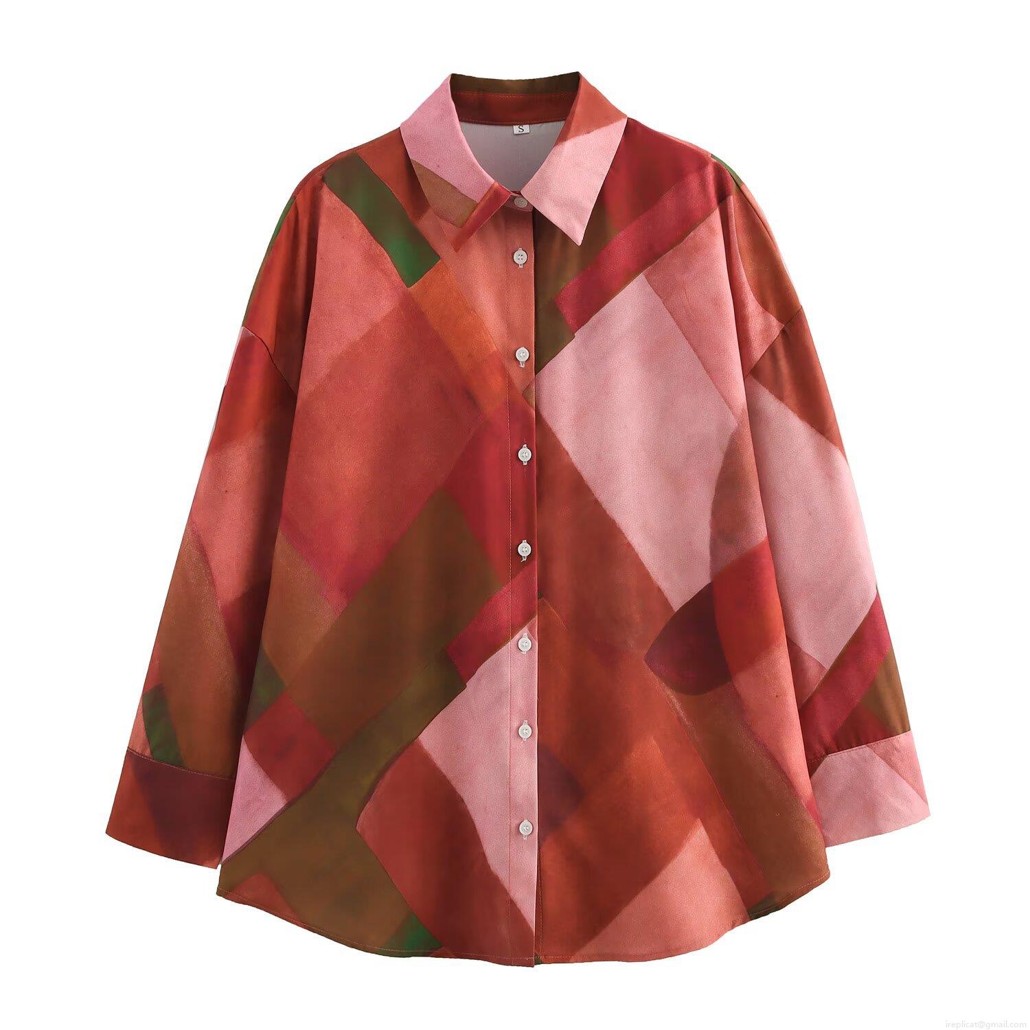 • Women's Artistic Geometric Patchwork Satin Blouse Lapel Long Sleeve Button Down Loose Shirt Top For Spring Autumn Streetwear Fashion