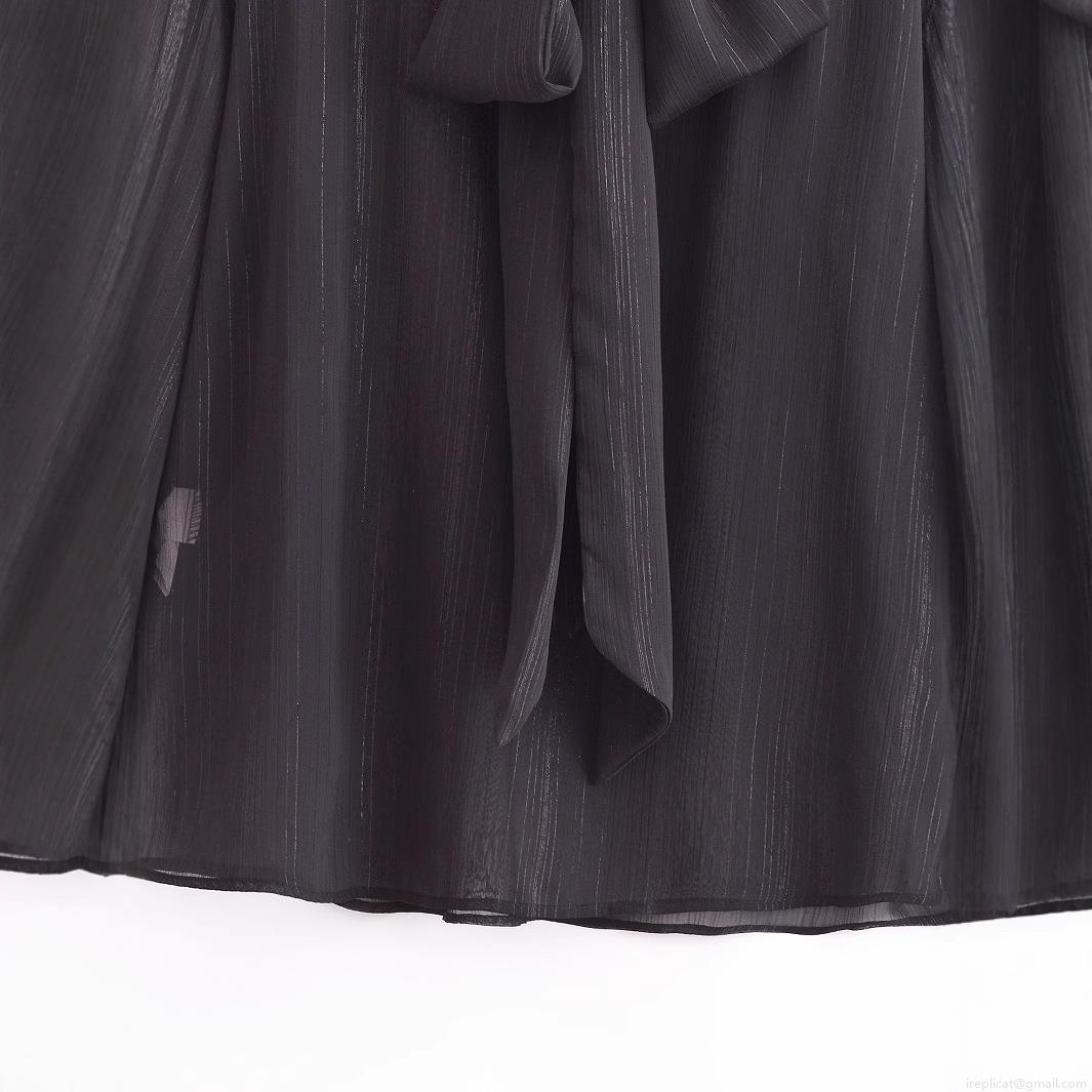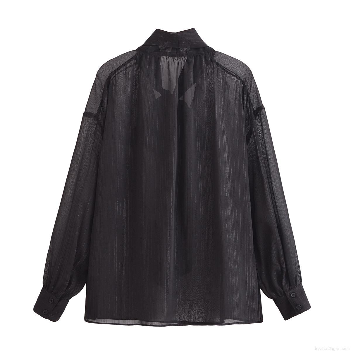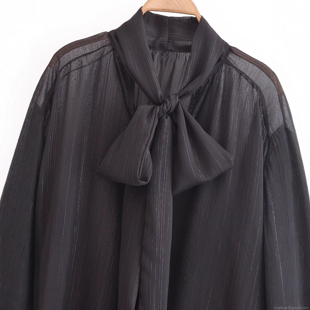 • Women's Black Sheer Chiffon Blouse Elegant Bow Tie Neck Long Sleeve Vertical Striped Shirt With Lurex Silver Thread Casual Office Wear