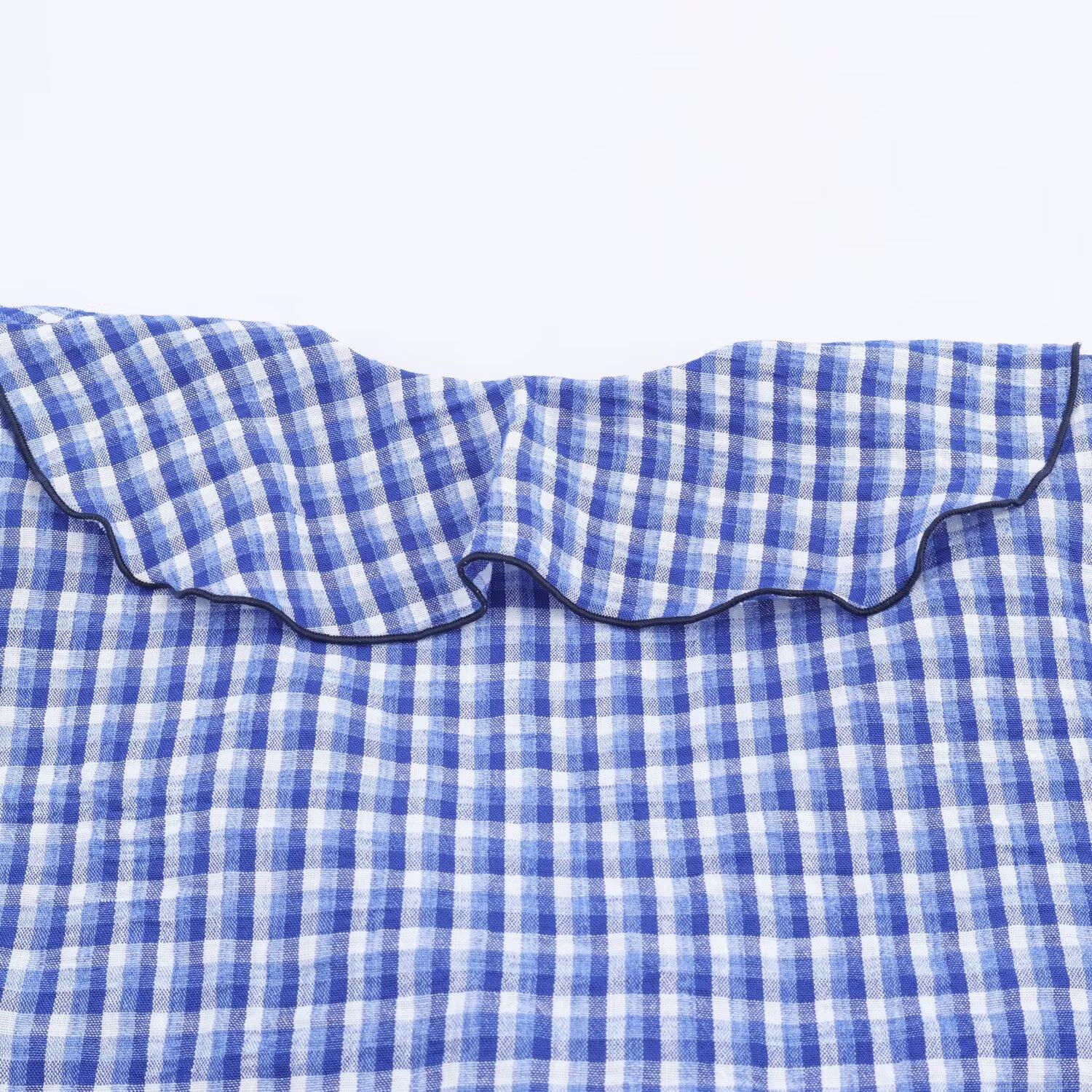 Women's Blue and White Gingham Plaid Shirt Ruffle Layered V-Neck Long Sleeve Blouse with Black Bow Tie Casual Sweet Vintage Style Office Tops