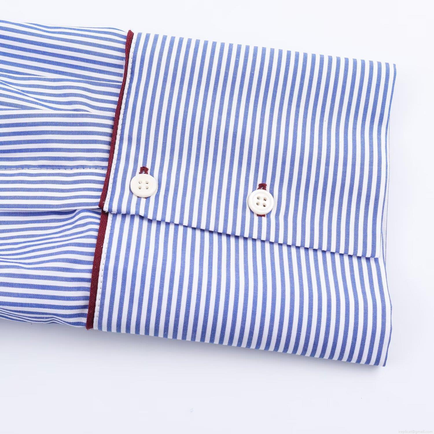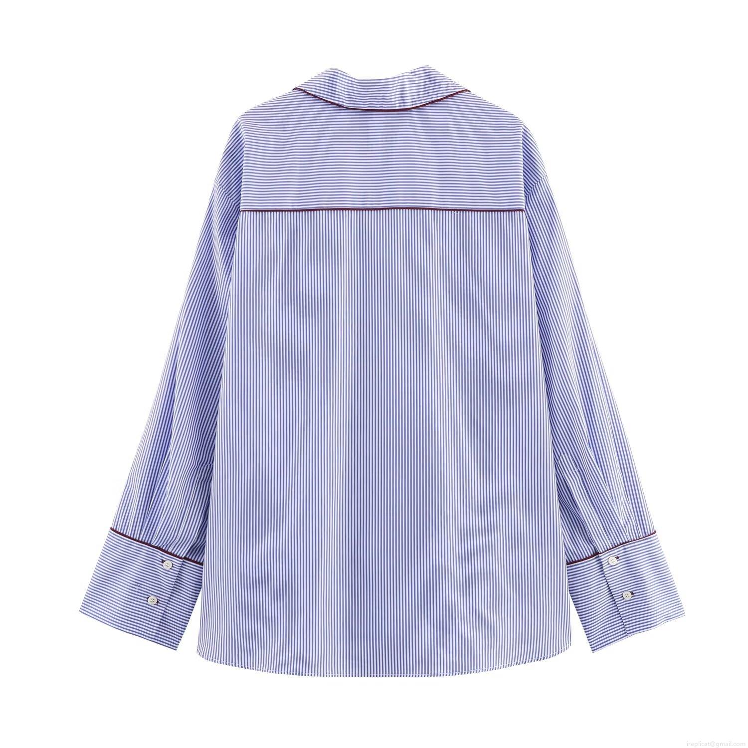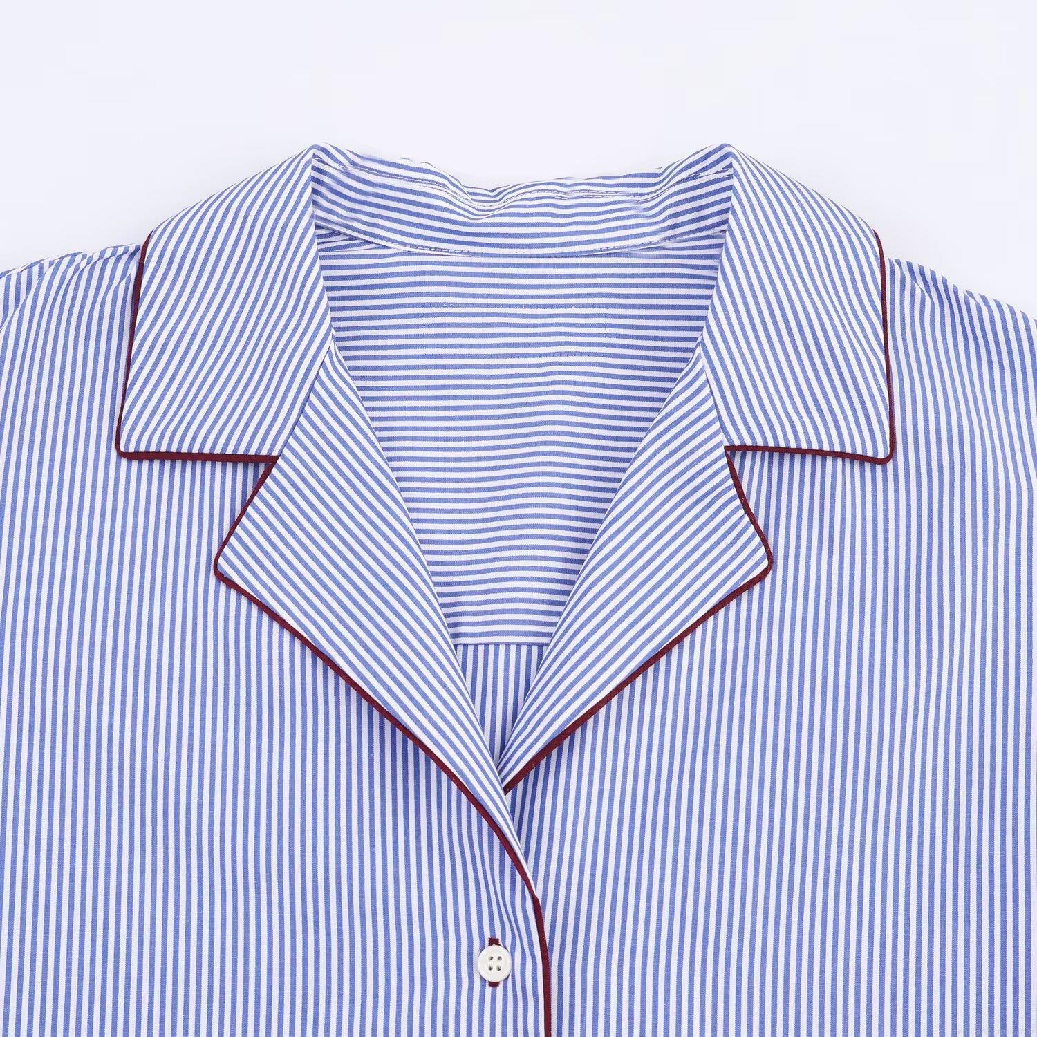 • Women's Blue and White Striped Poplin Polyester Shirt Contrast Red Piping Long Sleeve Loose Casual Pajama Style Top Blouse For Daily Wear
