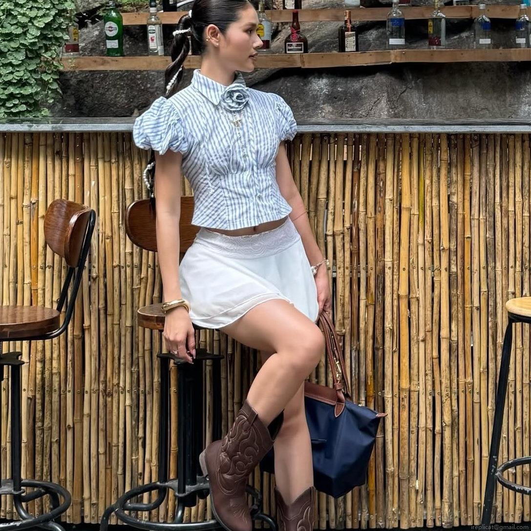 • Women's Blue White Striped Puff Sleeve Shirt Seersucker Short Sleeve Button Down Blouse Casual Summer Square Neck Top for Women Office Daily
