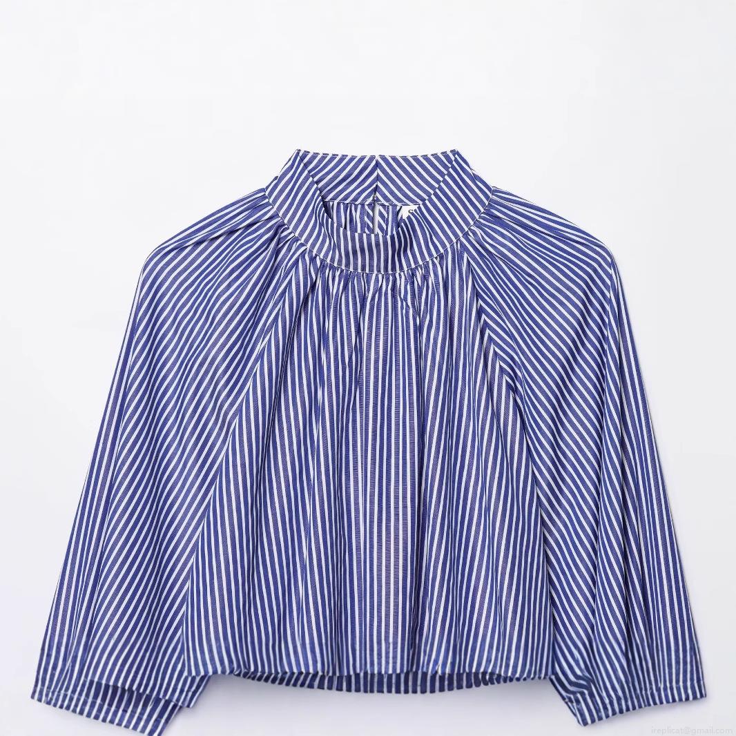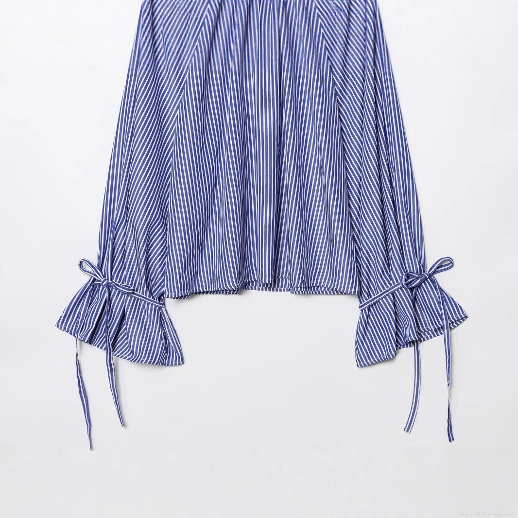• Women's Blue White Vertical Striped Polyester Blouse High Stand Collar Bell Sleeves With Bow Tie Casual Long Sleeve Shirt Elegant Office Top For Women