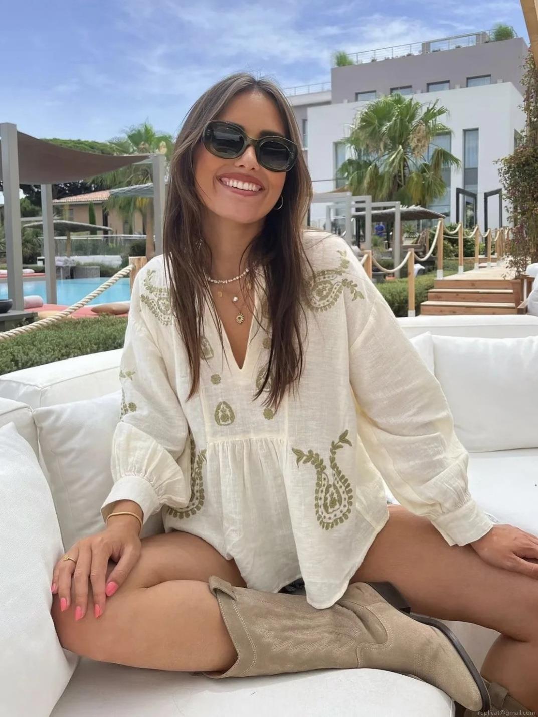 • Women's Bohemian 100% Cotton Embroidered Blouse V Neck Lantern Long Sleeve Loose Casual Vacation Ethnic Style Shirt Top