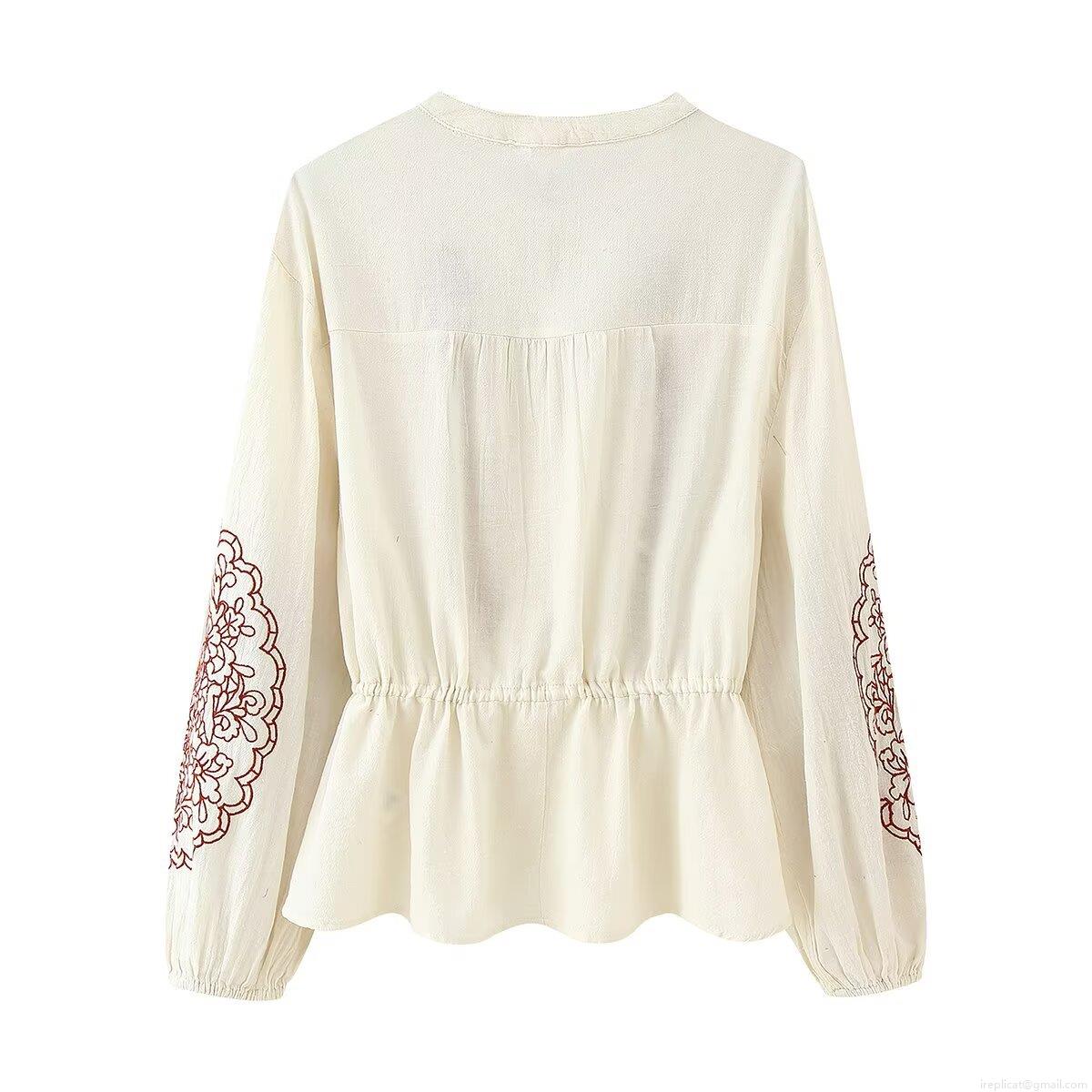 • Women's Bohemian Ethnic Floral Embroidery Blouse Vintage Round Neck Lantern Sleeve Lace Patchwork Drawstring Waist Peplum Shirt Top